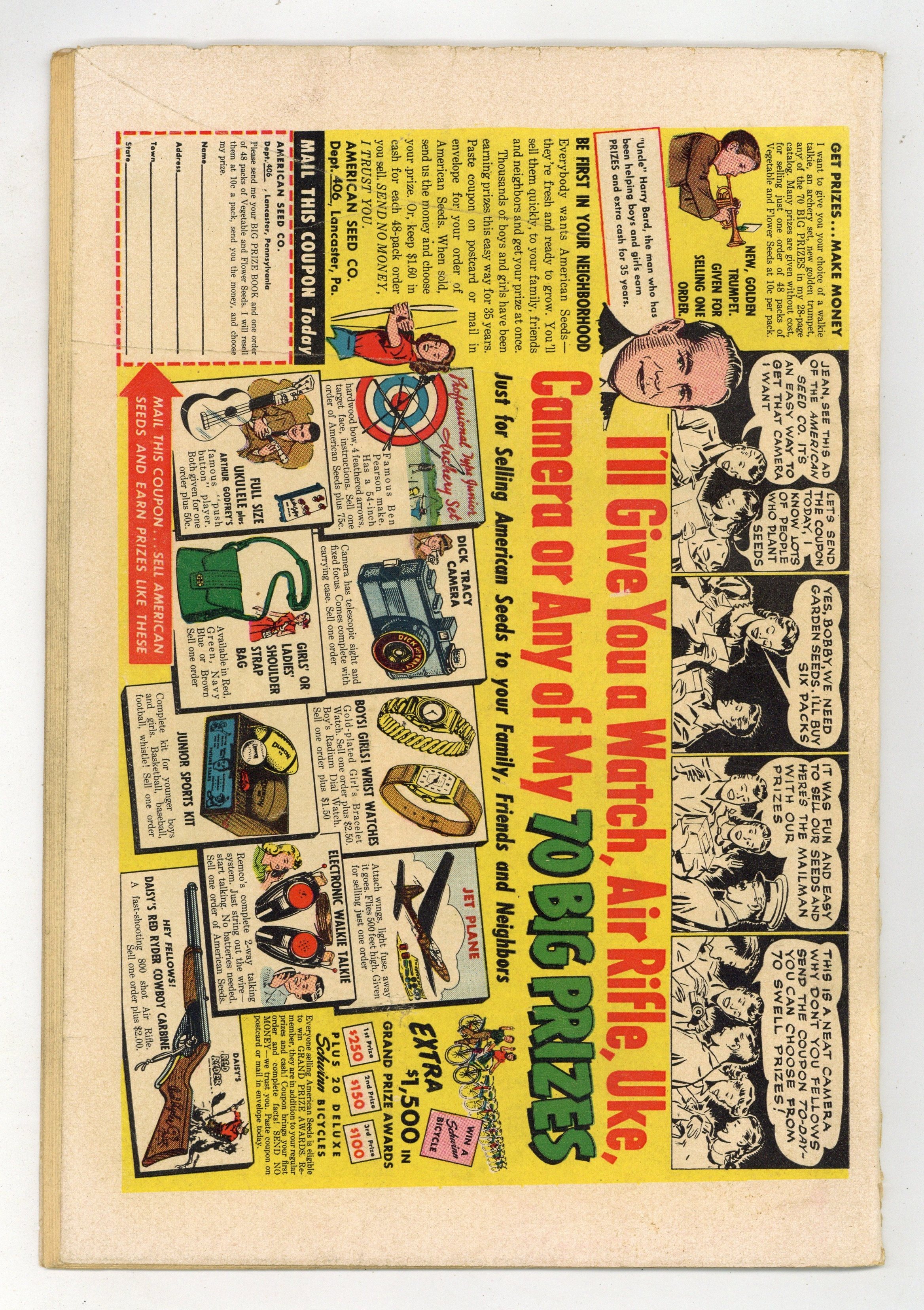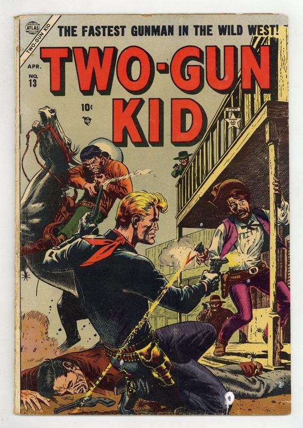 Starts May 11 Cover by Russ Heath. Untitled story, art by Bob Fujitani; After a successful raid of a stagecoach carrying gold, the Flaminco gang head back across the Mexican border; Shortly after the attack the Two-Gun Kid comes across the coach and investigates. Untitled story, art by Bob Fujitani; After having bought a new guitar the Two-Gun Kid beds down on the range for the night; In the middle of the night he is awoken by a stampede and barely avoids getting trampled to death. "Gun Wild" text story. Untitled story, art by Dick Ayers; Kid Colt tries to spend the night in a bunk house when he is recognized and has to fight for his life to escape; The Kid manages to escape, but takes a bullet in the chest trying to get away. Untitled story, art by Bob Fujitani; As the Two-Gun Kid is riding to help his friend Tom Wayne and his Lazy W ranch from attacks by Blade Ramrod and his Bloody Mountain Raiders, he is shot at by the gang. 36 pgs., full color. $0.10. Cover price $0.10. Grade: VG+ 4.5 explanation of grade Condition: Used (collectible)