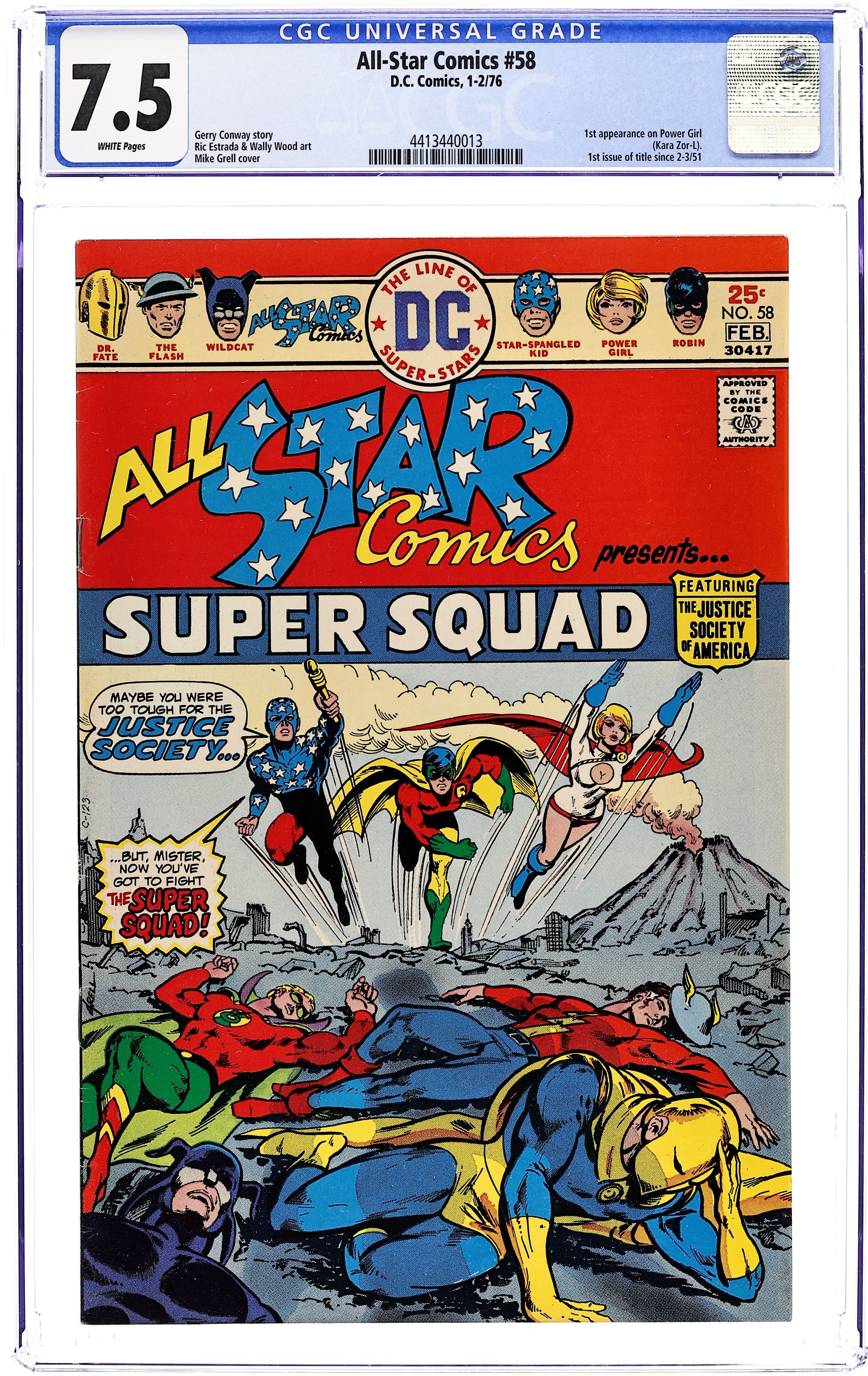 1st appearance of Power Girl. Cover art by Mike Grell. The Super Squad! starring the All Star Super Squad, script by Gerry Conway, pencils by Ric Estrada, inks by Wally Wood; Power Girl describes the Super Squad as a strike force composed of the JSA and the three younger heroes--Robin, Power Girl, and Star-Spangled Kid. Letters from Roy Thomas and Jerry Bails. The Captive Commissioner Hostess ad starring Batman, pencils by Curt Swan, inks by Vince Colletta. 36 Pages, Full Color. Cover price $0.25. Grade: CGC 7.5 explanation of grade Condition: Used (collectible)
