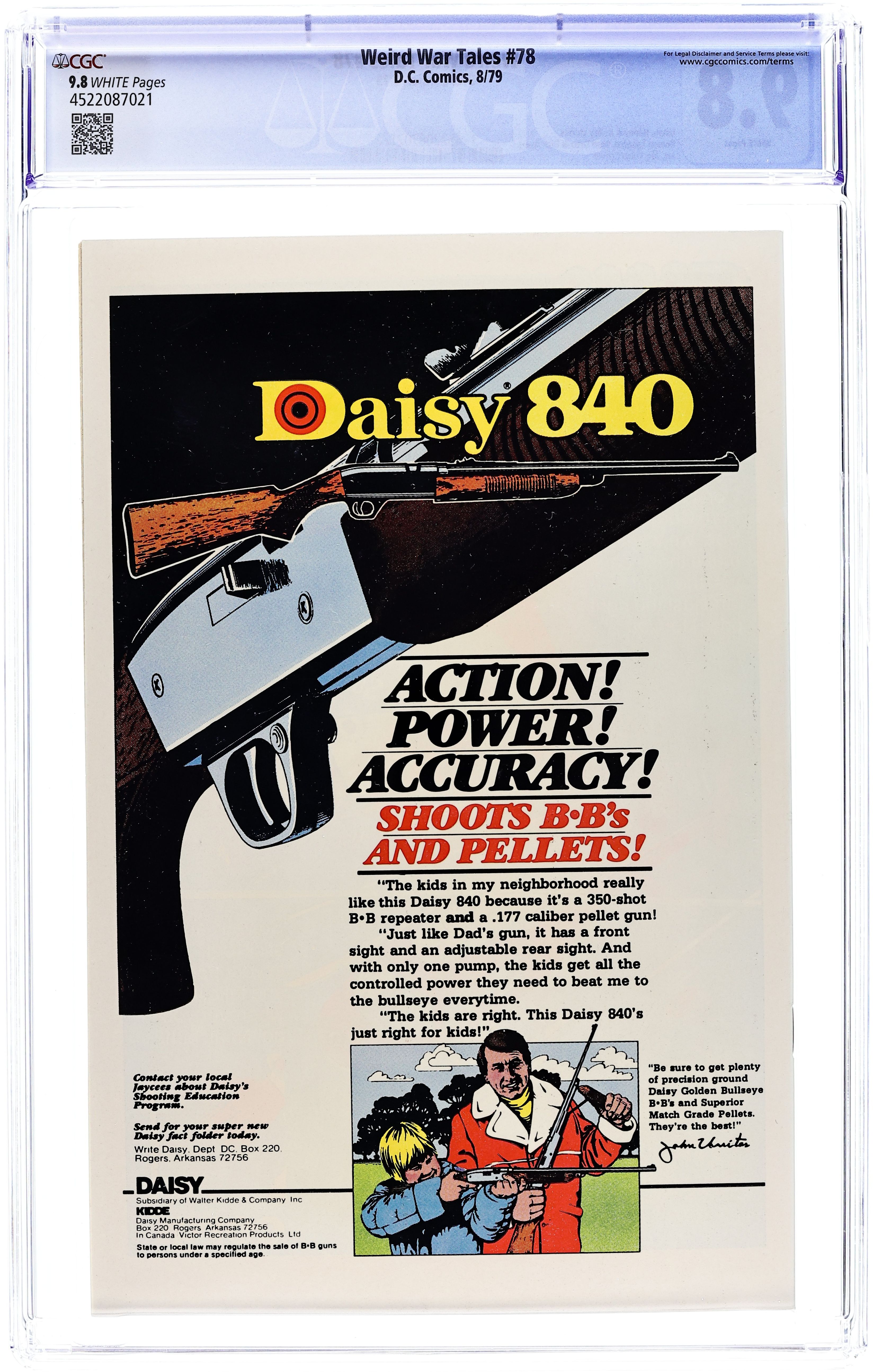 Cover art by Joe Kubert. One page of Romeo Tanghal art. The Indian War in Space, script by Michael Uslan, art by Romeo Tanghal; set sometime in the future in space. Eddie!, script by Bob Haney, pencils by Juan Ortiz, inks by Frank Chiaramonte; set during World War II; includes robotic soldiers similar to G.I. Robot. The Tunnels, script by Murray Boltinoff, pencils by Dick Ayers, inks by John Celardo; set in South Vietnam during the Vietnam War. 36 pgs. $0.40. Cover price $0.40. Grade: CGC 9.8 explanation of grade Condition: Used (collectible)