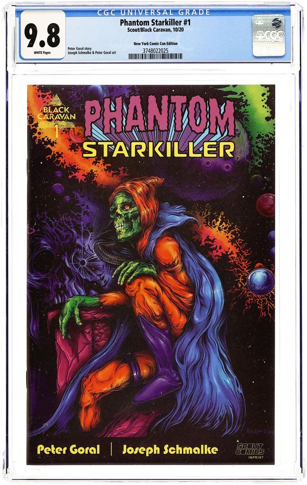 New York Comic Con variant cover by Michael Gilreath. Written by Peter Goral. Art by Joseph Schmalke. Black Caravan imprint. For uncounted millennia, the Cryptocrystalline Stone remained lost to the blackness of space, hidden amongst the stars... As time passed, the galaxy slipped into greater peril - thousands of systems fell and worlds crumbled. Dark and ominous beings conspire from the shadows to possess its unlimited power and ability to resurrect a legion of deathless warriors. From the vastness of the unknown regions, whispers of his return paralyzed ALL in fear -Phantom Starkiller, The Cosmic Ghoul Warrior must now unleash his inner darkness to carry out his master's wishes, all while plotting his revenge; for he cannot stop his interstellar rampage until The Curse of The Cryptocrystalline Stone has been broken! Scout Comics and Black Caravan are proud to bring you a thrilling psychedelic space odyssey based on the wildly popular toy line by Killer Bootlegs and Super7! 32 pages, full color. Cover price $3.99. Grade: CGC 9.8 explanation of grade Condition: Used (collectible)