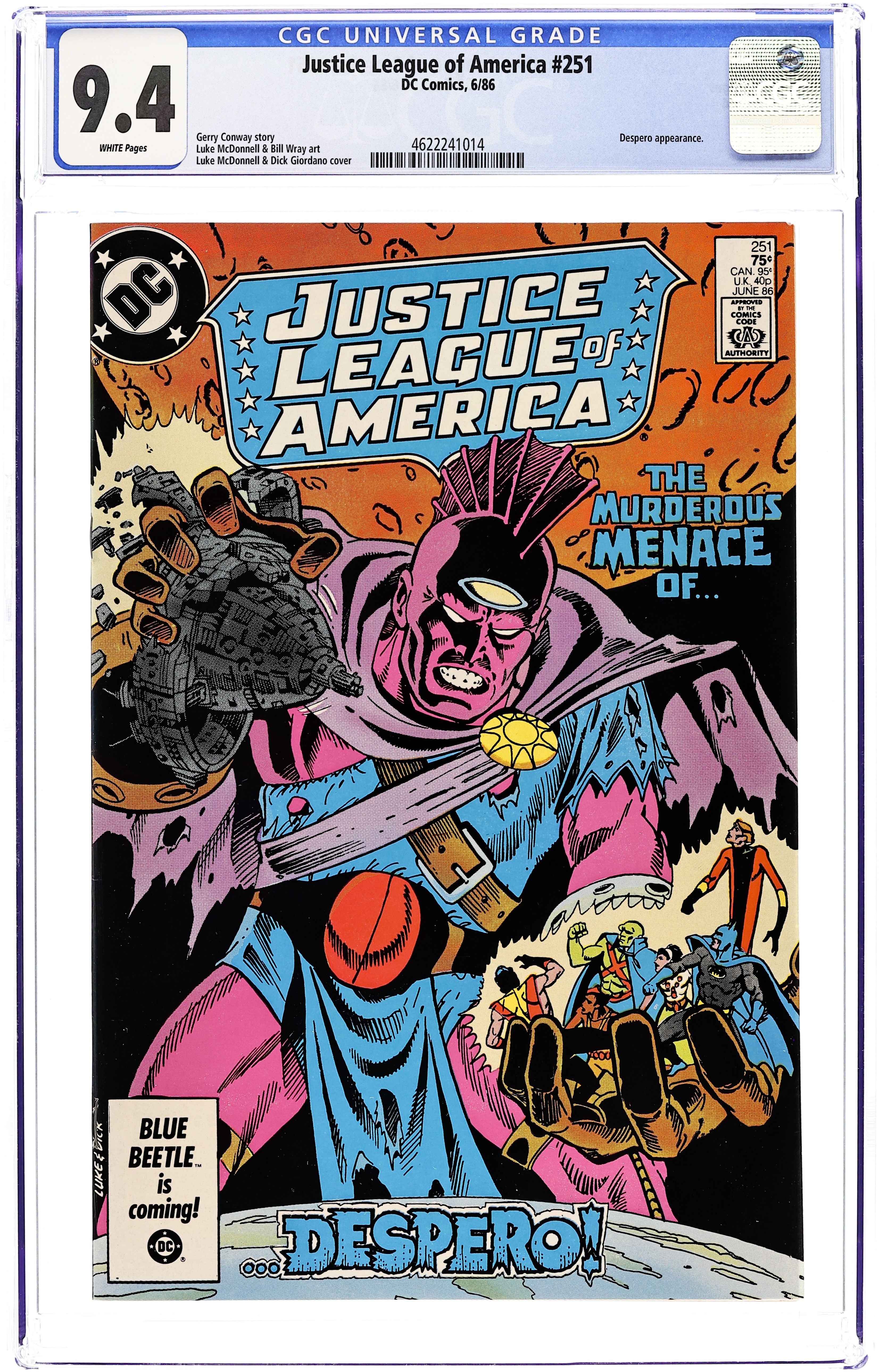 Ended Nov 24 2025 Bid History 7 bids Winning Bid $13 Batman's back to lead the world's greatest super-heroes, but can he emerge victorious over an all-new Despero?! Part 1 of 4, continued next issue. Written by Gerry Conway, with art by Luke McDonnell and Bill Wray. Cover by McDonnell and Dick Giordano. Cover price $0.75. Grade: CGC 9.4 explanation of grade Condition: Used (collectible)