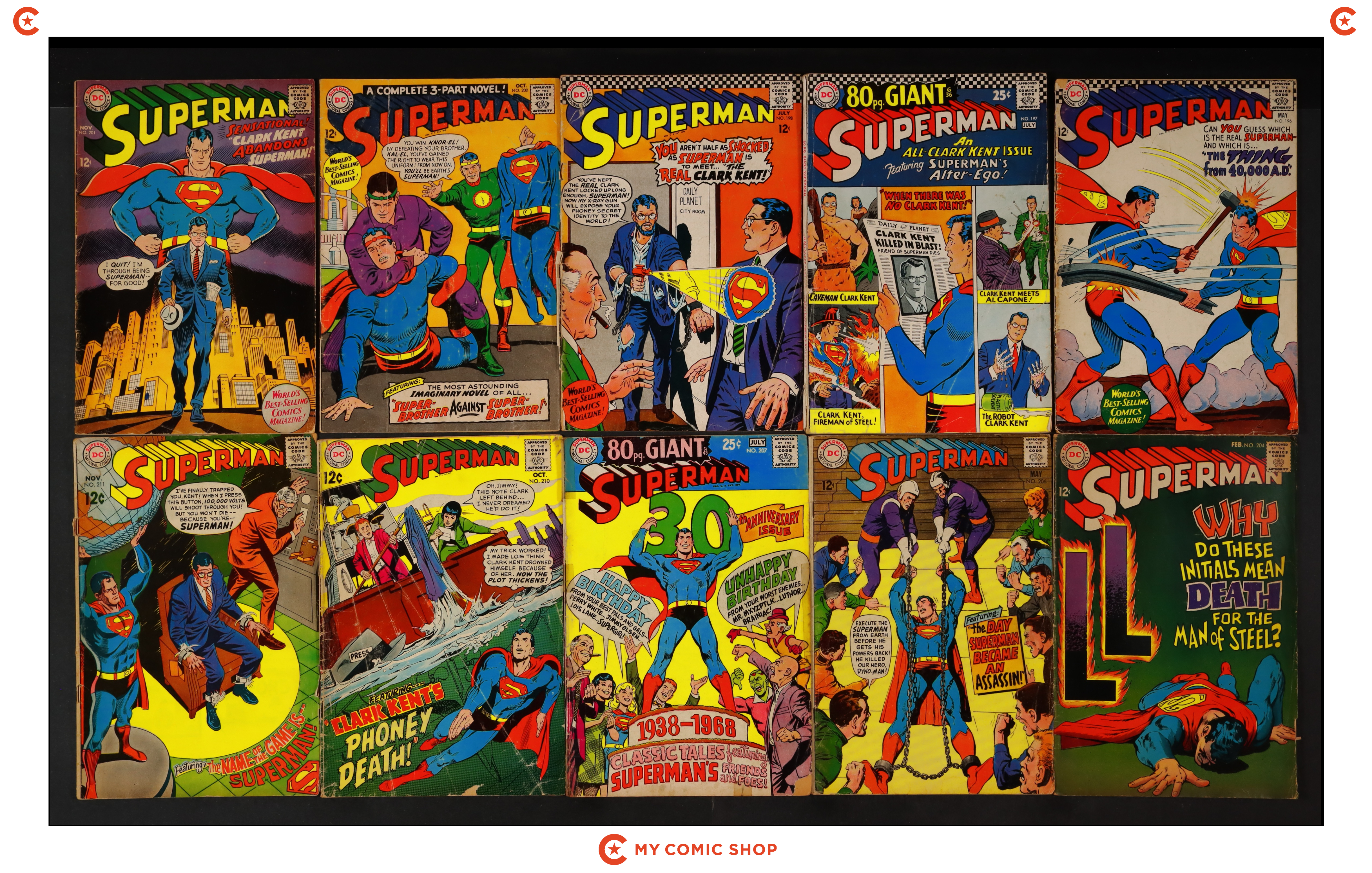 Issues 196-198, 200, 201, 204, 206, 207, 210, 211 of Superman (1939 1st Series). Most will grade in the Most will grade in the FR to GD range with #197, and #198 grading PR.