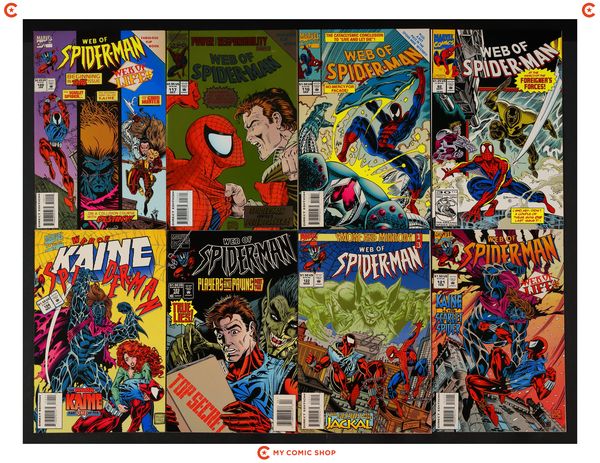 Issues 92, 116D, 117A.D, 120-123, 124D, 125D, 126D, 127 of Web of Spider-Man (1985 1st Series). Most will grade in the FN/VF to VF/NM range, with 126 grading at VG/FN range.