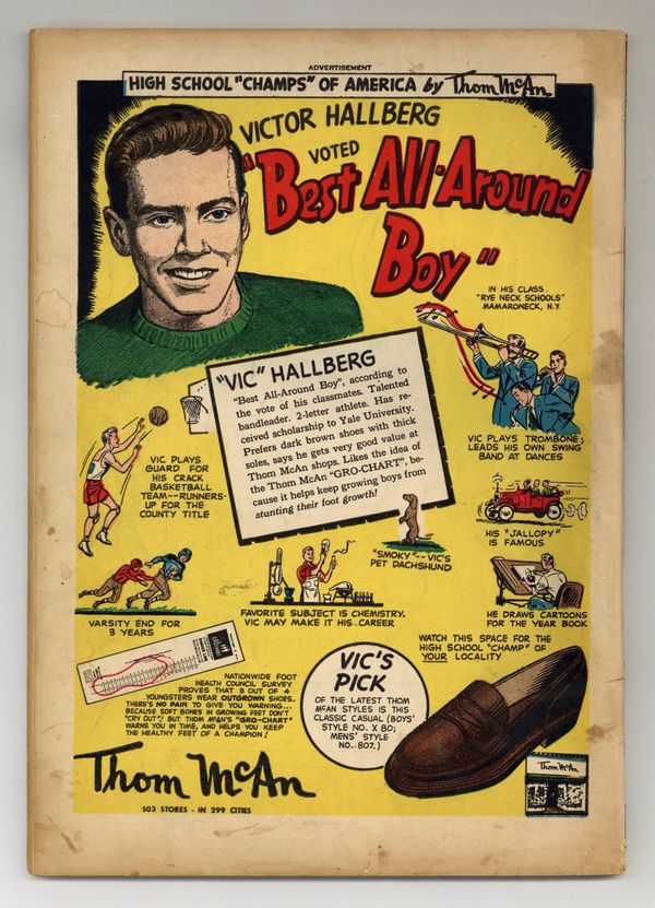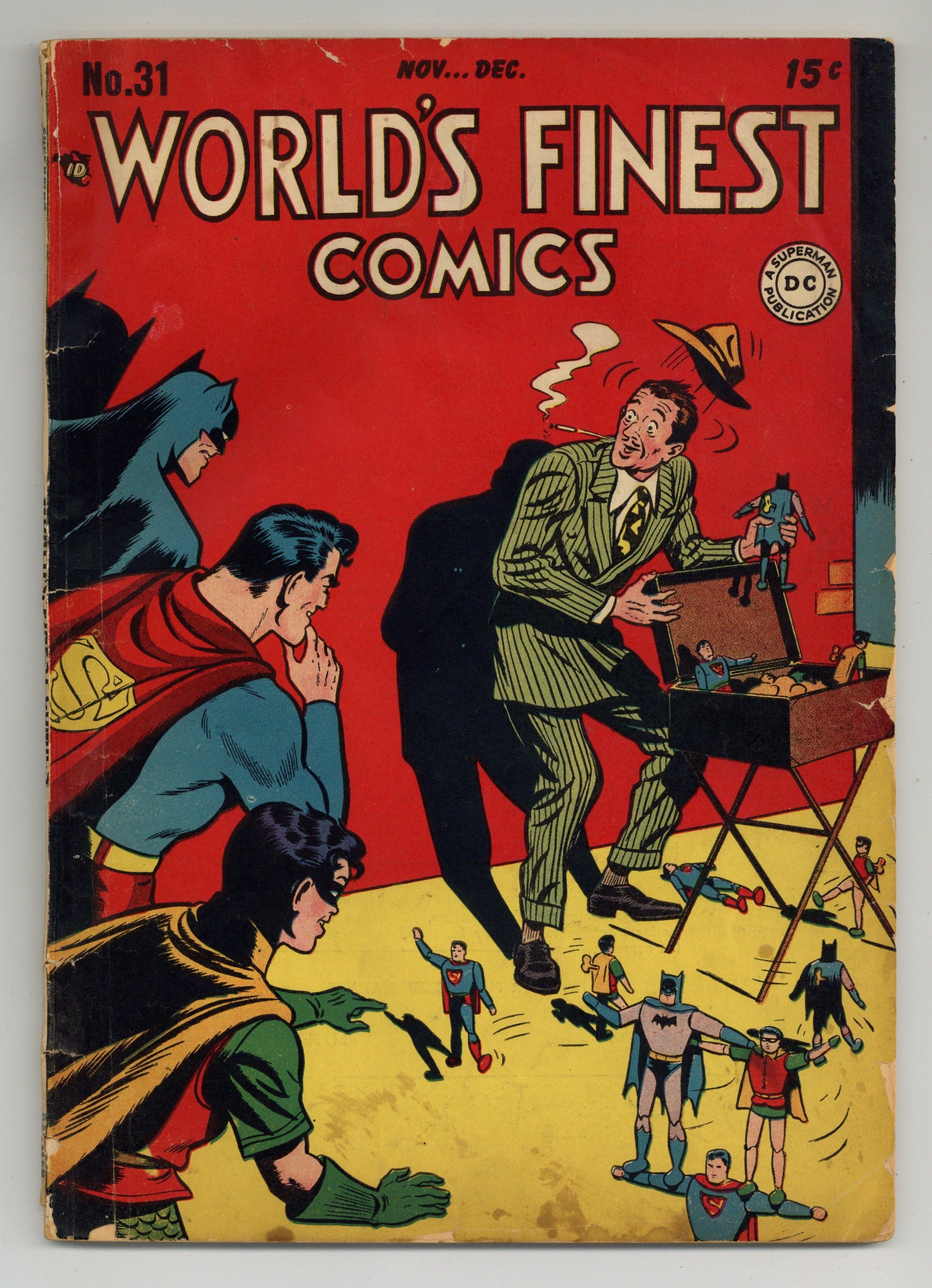 Cover pencils by Jack Burnley, inks by Charles Paris. Superman's Super Rival, script by Alvin Schwartz ? [as Jerry Siegel], pencils by Ira Yarbrough [as Joe Shuster], inks by Stan Kaye ? [as Joe Shuster]; Petty crook Dan the Dunce, tired of always getting beat up in the ring, sees an ad in a magazine for Dormital, and he thinks it will give him super-muscles, so he slugs down half a bottle. Hilarious Harold starring Zatara, art by William F. White. The Who Zoo Crimes starring Green Arrow, art by George Papp. Bebe humor two-pager by Henry Boltinoff. The Lancers Ride Again starring The Boy Commandos, script by Bill Finger, pencils by Curt Swan. The Quick Change Artist starring Three-Ring Binks, script and art by Jack Farr. The Man With the X-Ray Eyes! starring Batman and Robin, script by Don Cameron, pencils by Bob Kane, inks by Ray Burnley; A World War 2 ace gains x-ray vision after a plane crash and turns criminal, but is exonerated by a Grand Jury when they learn of the details of his accident. 76 Pages, Full Color. Cover price $0.15. Grade: GD+ 2.5 explanation of grade Condition: Used (collectible)