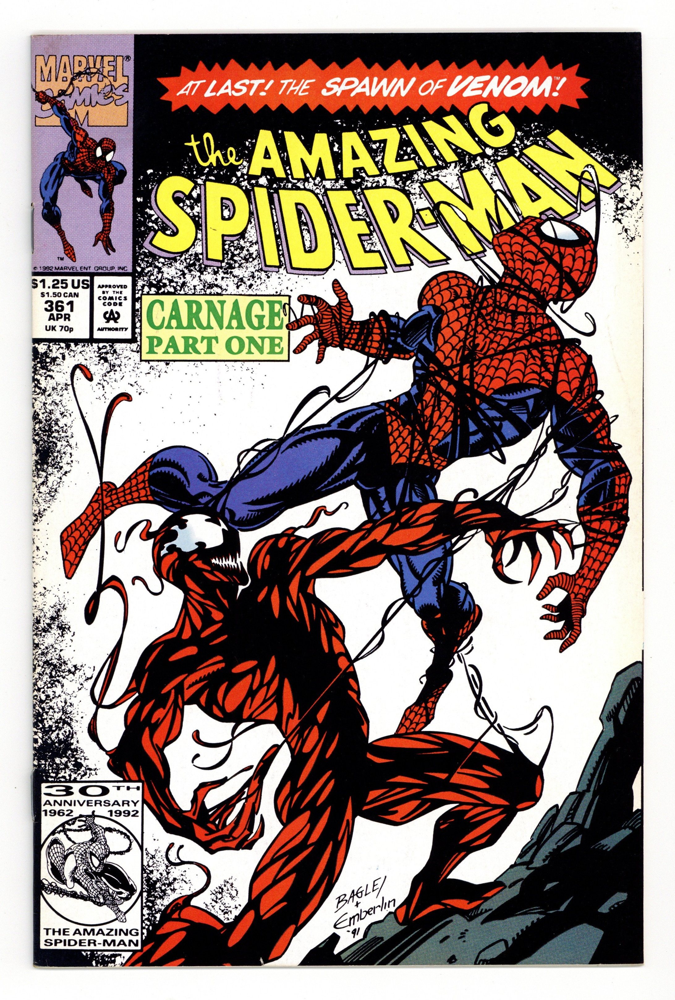 Starts Dec 8 First Printing. Direct Edition. First (full) appearance of Carnage in "Savage Genesis!" Part 1 of 3. Script by David Michelinie. Pencils by Mark Bagley. Inks by Randy Emberlin. Cover by Mark Bagley and Randy Emberlin. Blood runs in the streets as a serial killer roams New York City! And as the web-slinger investigates the murders, he notices a very disturbing similarity to another killer's modus operandi! In a burned-out building in Brooklyn, the spectacular one comes face-to-face with his new homicidal foe...Carnage! Can the wall-crawler end Cletus Kasady's rampage in their very first encounter? Cameo appearances by Aunt May and Mary Jane Watson. Flashback cameo by Venom. (Note: This three-part story was reprinted in 2011 in the trade paperback: Spider-Man -- The Vengeance of Venom.) 36 pages, full color. $1.25 cover price. NOTE: Most of these were distributed with slight printer tears in the bottom edge of the cover. Cover price $1.25. Grade: VF 8.0 explanation of grade Condition: Used (collectible)