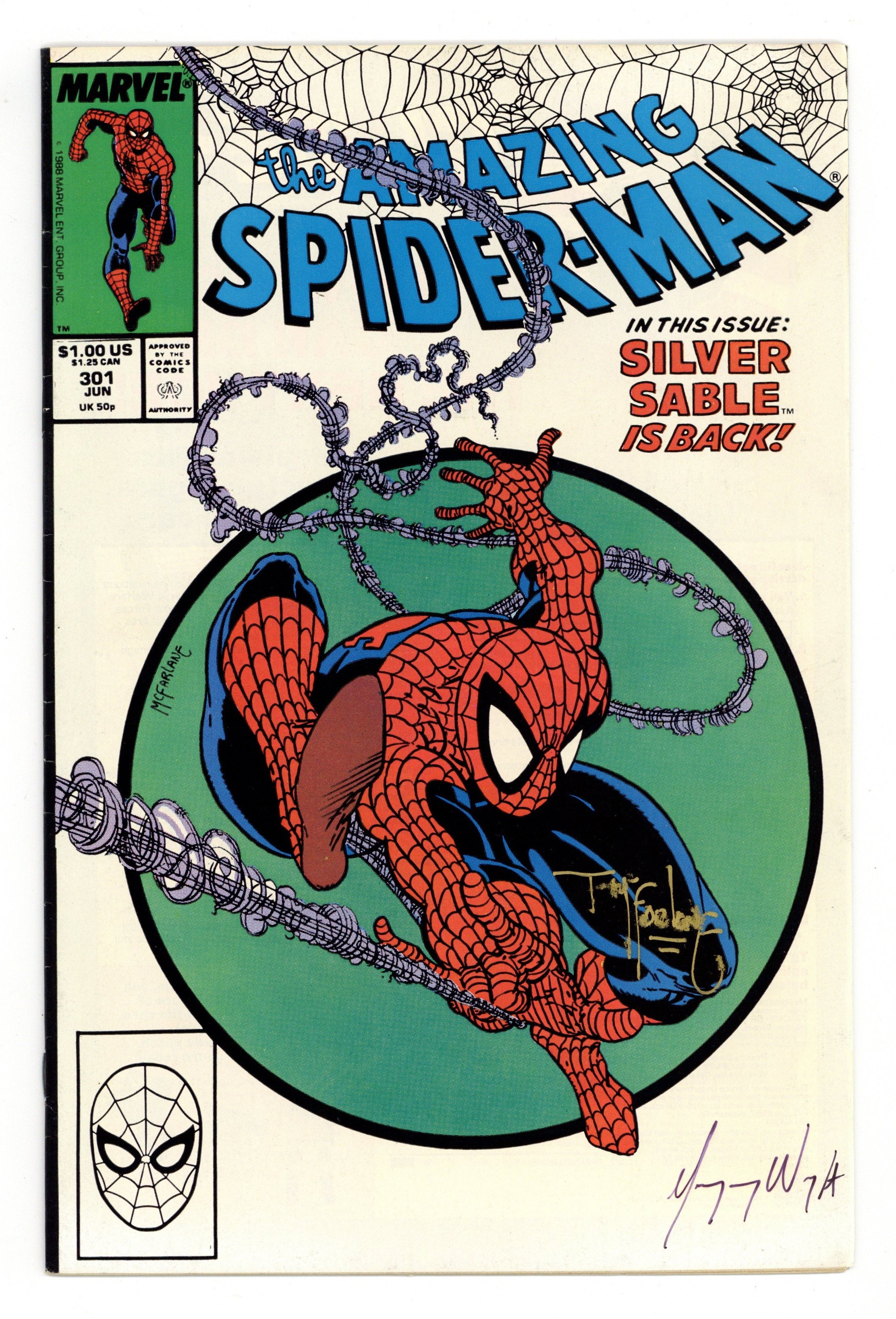 Ended Oct 27 2025 Bid History 20 bids Winning Bid $100 Direct Edition. "The Sable Gauntlet!" Guest-starring Silver Sable. Script by David Michelinie. Art by Todd McFarlane. Cover by Todd McFarlane. The first 300 issues of the Amazing Spider-Man are in the books after the web-slinger's epic battle vs. Venom last issue! And now the next chapter in the wall-crawler's anthology begins with an encounter with his favorite mercenary: Silver Sable! The enchanting sable agrees to make a test run through the security systems of a new high-rise office building, but deadly danger awaits on the top floor! Will Spidey catch the elevator in time? Cameo appearances by Mary Jane Watson and Dr. Morris Sloan. First $1.00 issue. (Notes: The cover is the same artwork (with different colors) as the cover to issue 300. This issue includes a full-page ad for the first appearance of Typhoid Mary in the Daredevil (1st) series -- art by John Romita Jr. and Al Williamson. The letters page contains a statement of ownership: average print run 469,913; average paid circulation 284,692. 36 pgs. Cover price $1.00. Grade: FN+ 6.5 explanation of grade Condition: Used (collectible)