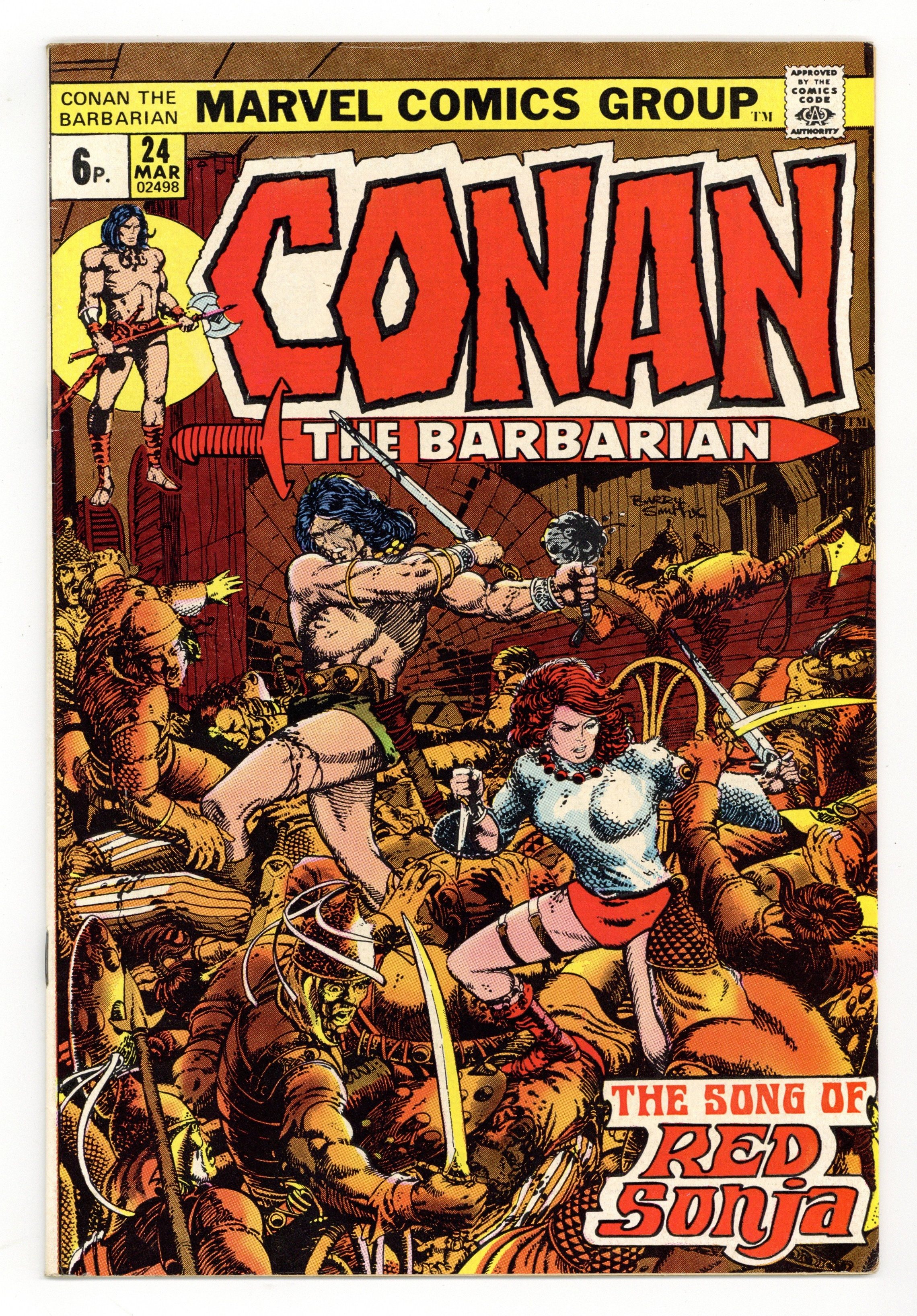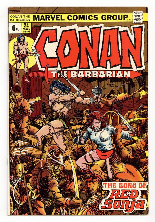 UK edition. Identical to US edition, but has 6p cover price. Cover art by Barry Windsor-Smith. First full Red Sonja story, The Song of Red Sonja, script by Roy Thomas, pencils by Barry Windsor-Smith; setting:Makkalet; Conan and Red Sonja start a bar-fight, bathe in a fountain, scale temple walls, break in and steal a snake-tiara, and fight a magical snake; at the end Sonja tricks Conan, and leaves for Pah-Disha; the Red Sonja story continues in Savage Sword of Conan 1. Final Windsor-Smith art on this title. The art in this issue (at least on page 8, and perhaps elsewhere) was altered without Windsor-Smith's approval. See Marvel Treasury Edition 15 or Savage Sword of Conan 82 for the original version. (The reprint in Conan Saga 8 contains the altered version). In the letters column, Roy Thomas responds and announces Barry Smith's final departure as Conan the Barbarian artist; Incidentally, Roy's responses to R. Benitz and Keith Taylor are mistakenly transposed.32 pgs. Grade: FN 6.0 explanation of grade Condition: Used (collectible)