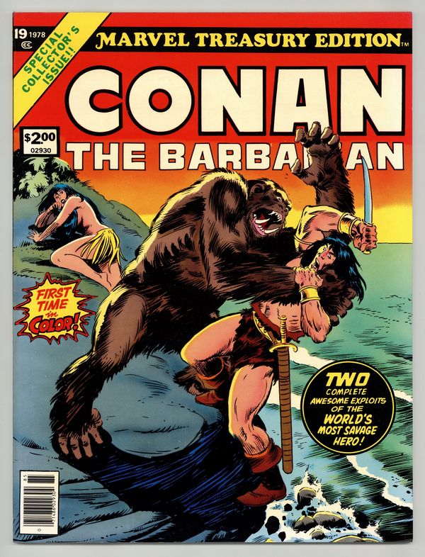 Ended Oct 27 2025 Bid History 26 bids Winning Bid $88 Marvel Treasury Edition (1974) #19 features Conan the Barbarian. Based on tales by Robert E. Howard. Adapted by Roy Thomas. From the pages of Savage Sword of Conan, this issue reprints some of the Cimmerian's most epic adventures for the first time in color. Includes "Iron Shadows in the Moon" (Reprints Savage Sword of Conan #4) art by John Buscema and Alfredo Alcala, and "The People of the Dark" (Reprints Savage Sword of Conan #6) art by Alex Nino. Plus, artists Dave Wenzel and Frank Thorne present their versions of King Kull, Red Sonja, and Cormac Mac Art. 80 pages. Cover price $2.00. Grade: VF 8.0 explanation of grade Condition: Used (collectible)