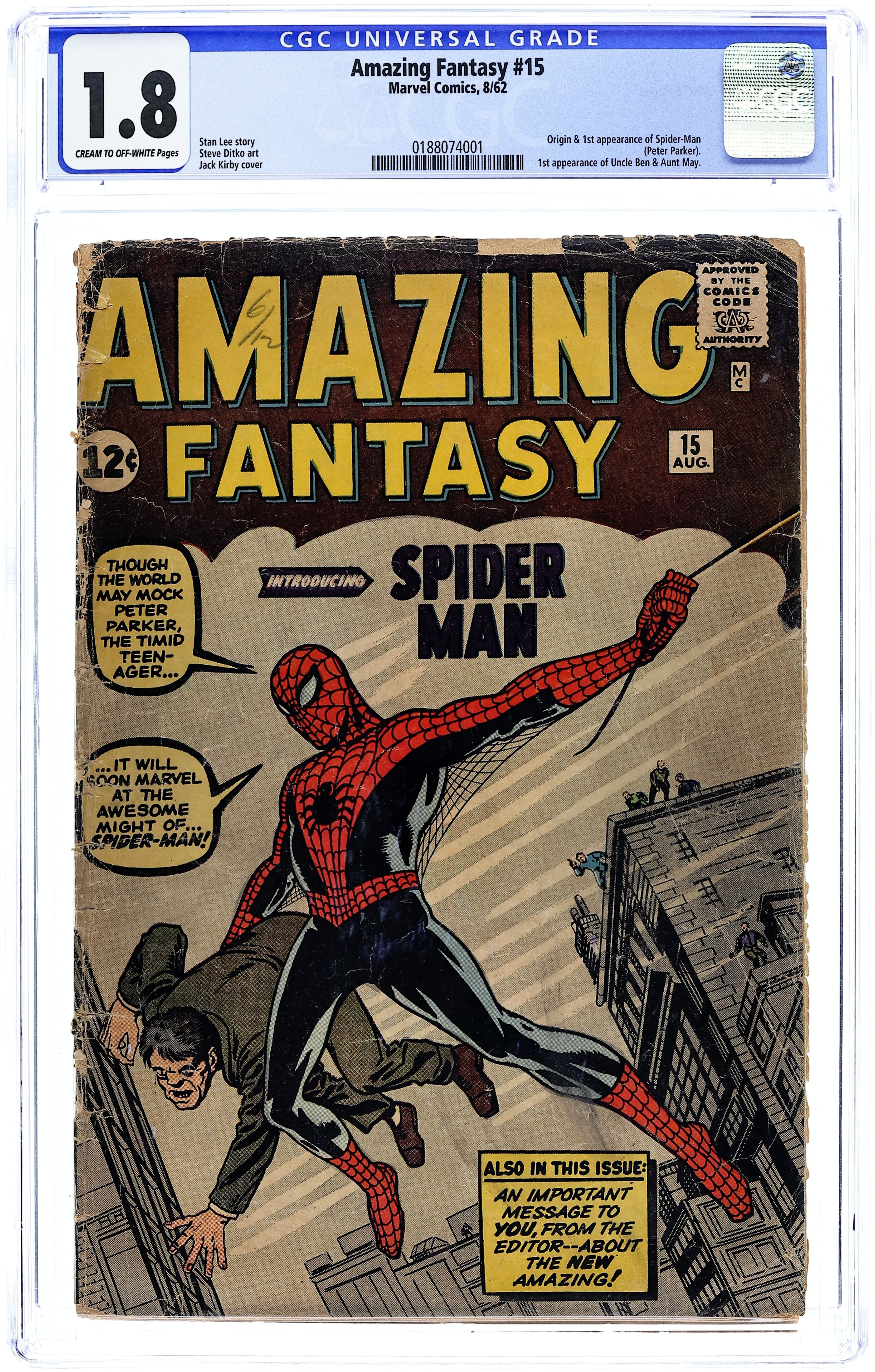 Ended Oct 14 2025 Bid History 41 bids Winning Bid $15,675 Origin and 1st Appearance of Spider-Man by Stan Lee and Steve Ditko (11pgs). 1st appearance of Aunt May and Uncle Ben. Cover pencils by Jack Kirby, inks by Steve Ditko. "Spider-Man!", script by Stan Lee, art by Steve Ditko; Peter Parker is bitten by a radioactive spider and gains the abilities of a spider; When he fails to stop a burglar who runs past him, his uncle is killed as a result; He therefore swears never to shirk his responsibility again. "The Bell-Ringer!", script by Stan Lee, art by Steve Ditko; On a small Mediterranean island of fisherfolk, Old Pedros is the town bell-ringer; One day the volcano atop the island begins to erupt; The villagers evacuate and put out to sea; Old Pedros, though, stays at the church; "The bells must be rung," he tells himself. "Man in the Mummy Case!", script by Stan Lee, art by Steve Ditko; A fugitive accepts a mummy's help to escape the police, only to find himself an ancient Egyptian slave. Stan Lee's editorial explaining title change. "There Are Martians Among Us!", script by Stan Lee, art by Steve Ditko; The discovery of a crashed flying saucer frightens a small town, especially when the townspeople realize that the Martians are among them; A month goes by with the aliens still at large. 36 pgs., full color. Cover price $0.12. Grade: CGC 1.8 explanation of grade Condition: Used (collectible)