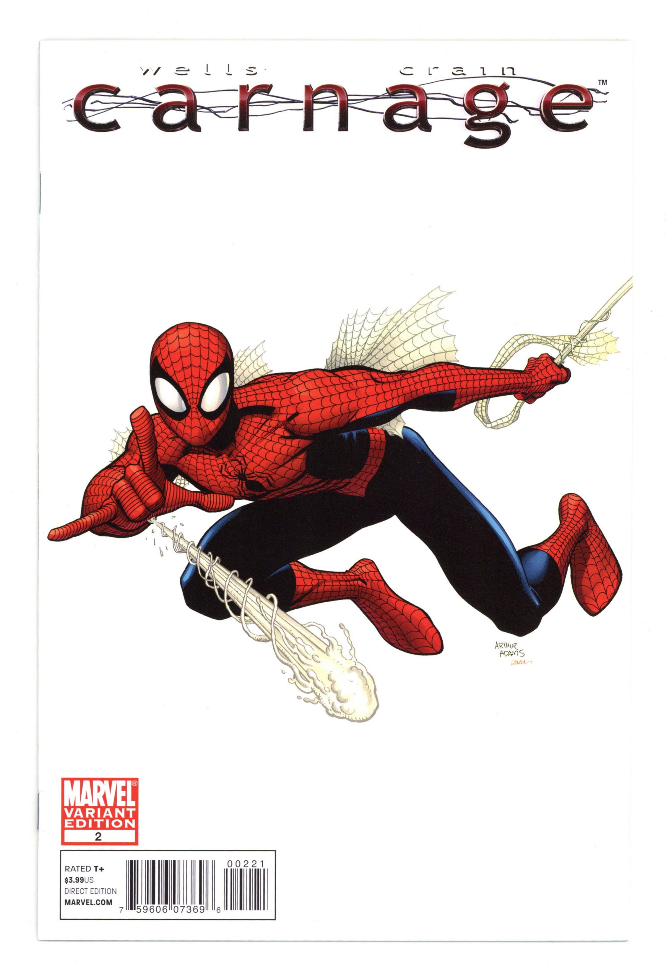 Limited 1 for 25 Variant Cover by ARTHUR ADAMS Written by ZEB WELLS Art by CLAYTON CRAIN The deadliest foe of Spider-Man is back! Web-Head teams up with Iron Man against a bloodthirsty force of evil and an army of super-powered menaces! The alien symbiote so twisted and murderous that it made Venom look like a choir boy has been brought back from space...but how? And without the without the psychopathic serial killer Cletus Kasady as its host, will Carnage be less dangerous...or more unhinged?! Don't miss the villainous threat that will test these two Avengers teammates to the limit of their strength - if it doesn't kill them! By Zeb Wells (AMAZING SPIDER-MAN) and Clayton Crain (X-FORCE)! 32 PGS./Rated T+ Cover price $3.99. Grade: VF+ 8.5 explanation of grade Condition: Used (collectible)