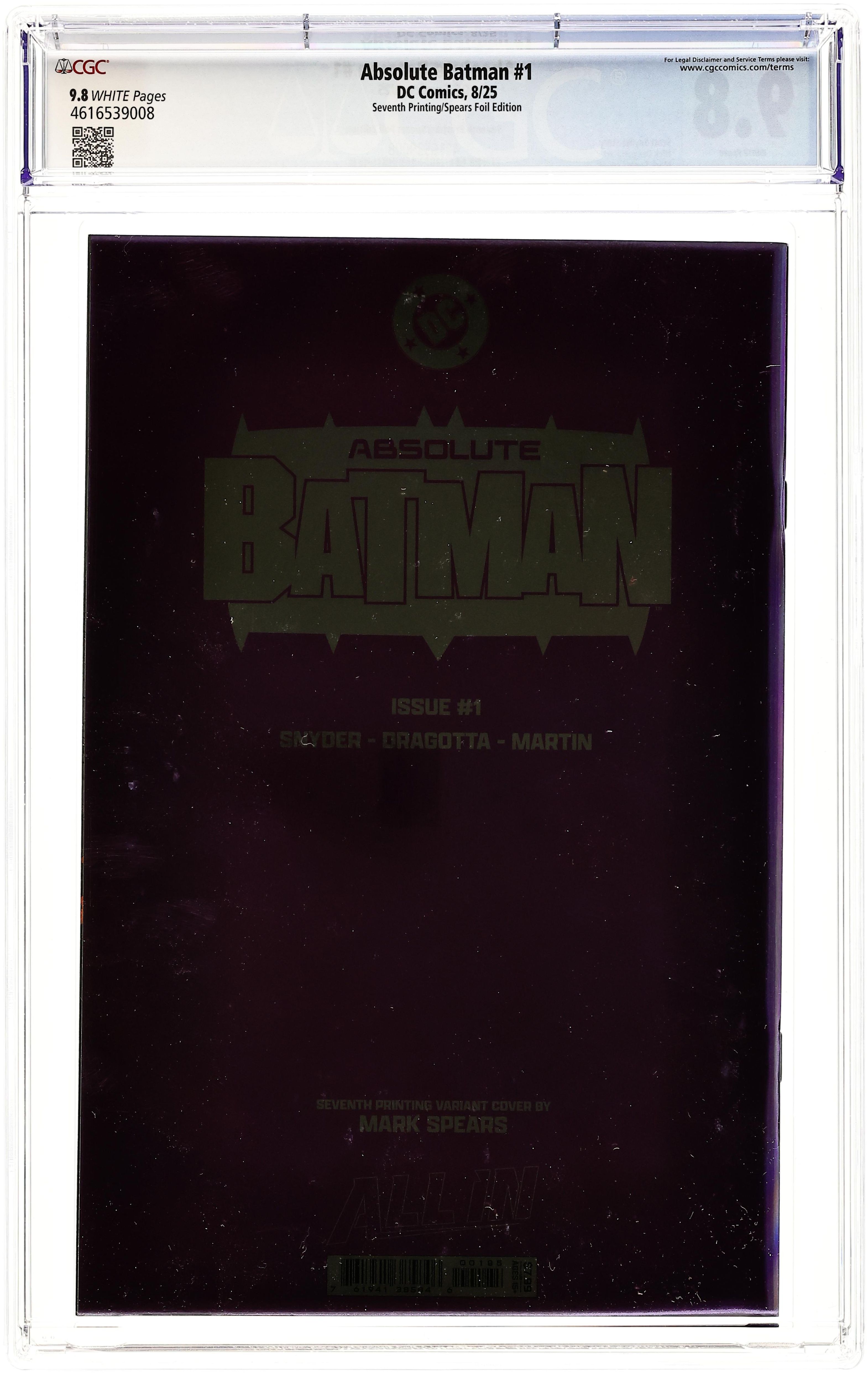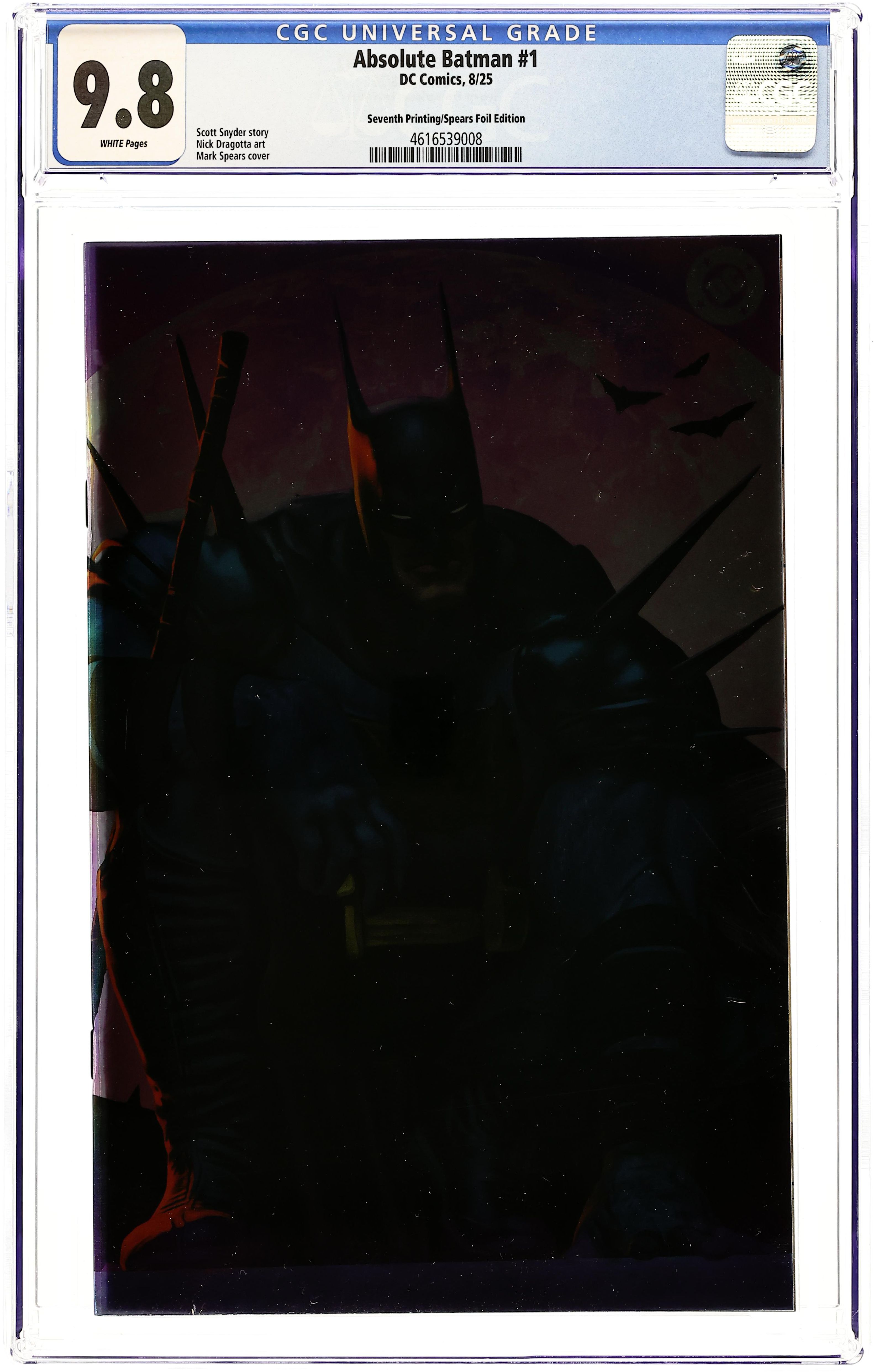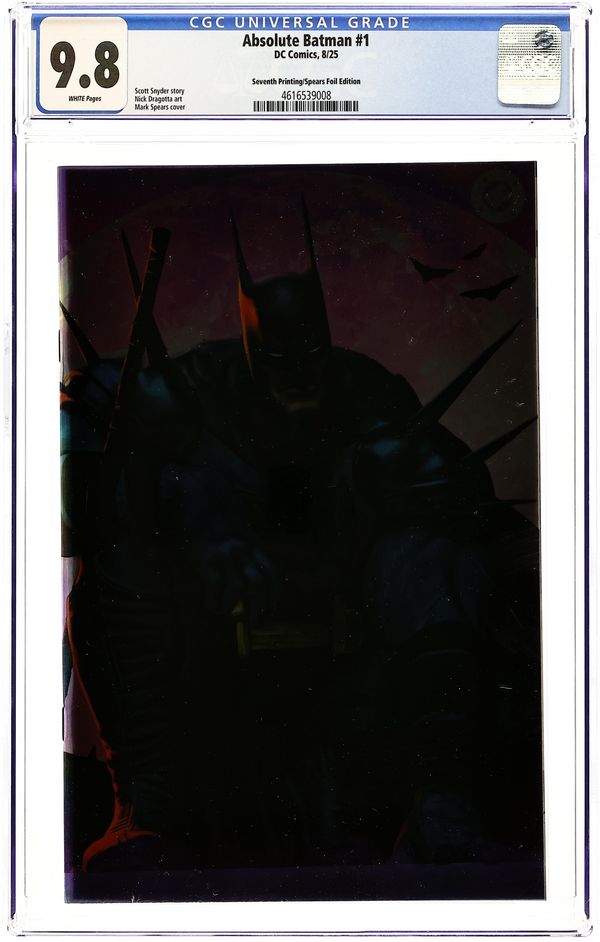 Ended Oct 17 2025 Bid History 16 bids Winning Bid $25 7th Printing, Cvr C. Foil Cover. Written by Scott Snyder. Art by Nick Dragotta. Cover by Mark Spears. BATMAN LEGEND SCOTT SNYDER AND ICONIC ARTIST NICK DRAGOTTA TRANSFORM THE DARK KNIGHT'S TALE FOR THE MODERN AGE! Without the mansion...without the money...without the butler...what's left is the Absolute Dark Knight! 48 pages, full color. Rated T+ Cover price $7.99. Grade: CGC 9.8 explanation of grade Condition: Used (collectible) unless item is a new release