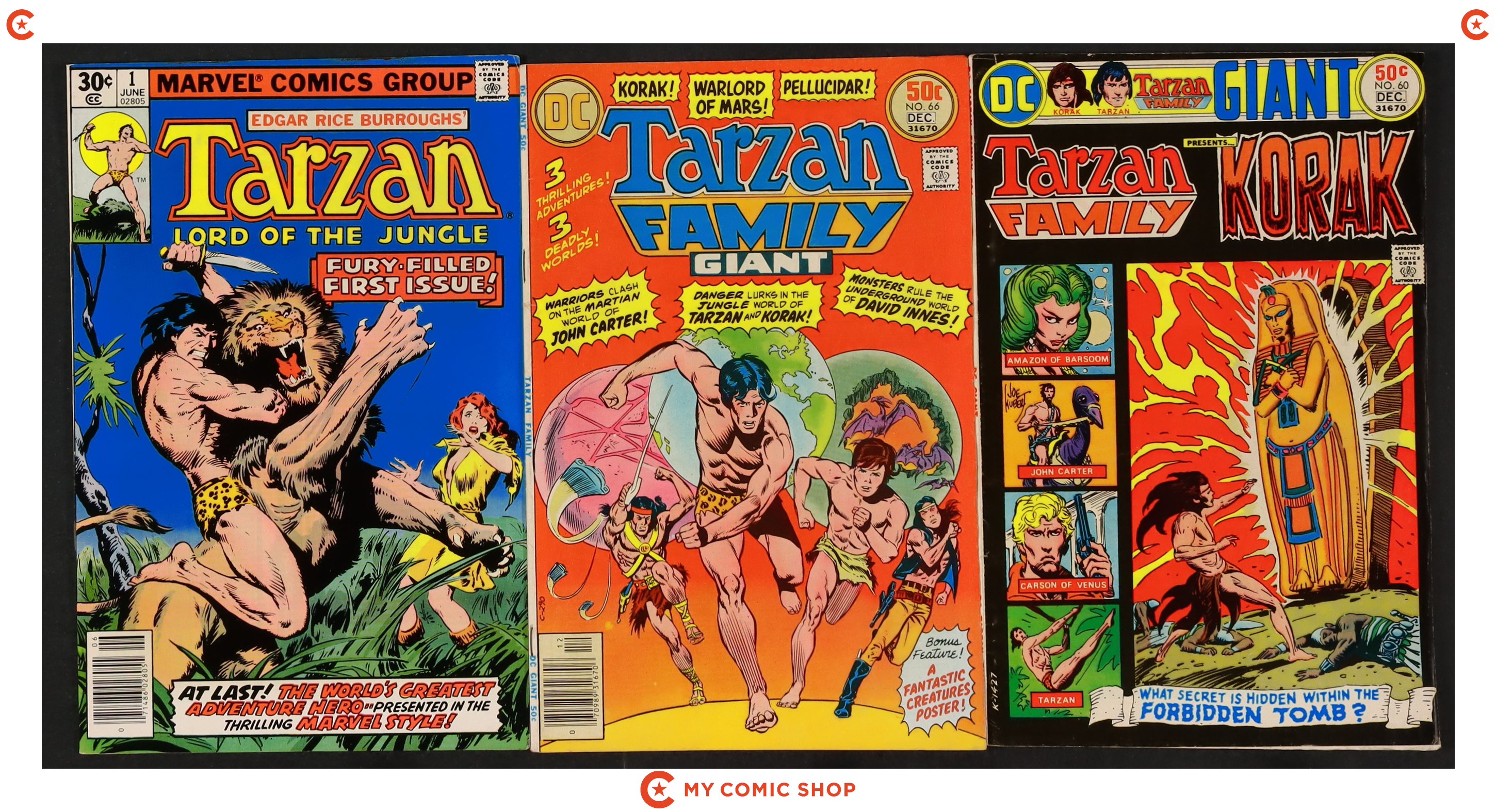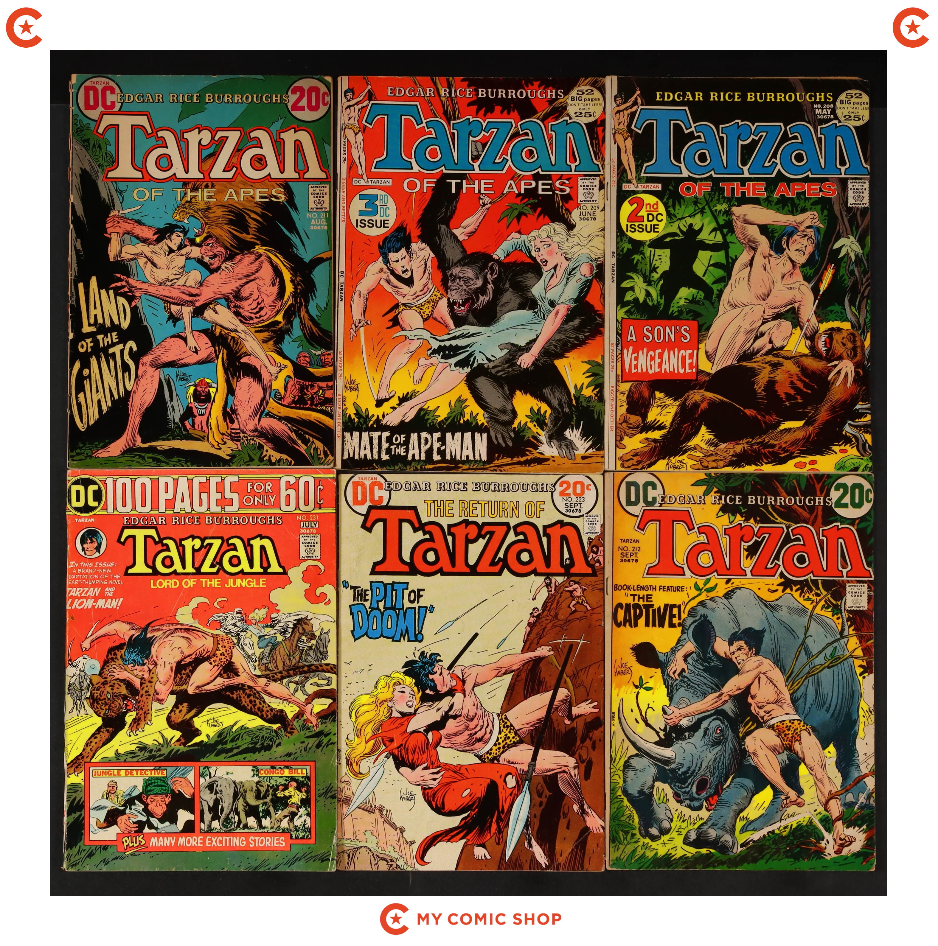 Issues 208, 209, 211, 212, 223, 231, of Tarzan (1972 DC), issues 60, 65 of Tarzan Family (1975), and issue 1 of Tarzan (1977 Marvel). Most will grade in the GD to VG range with #1 of Tarzan (1977 Marvel) grading FN.