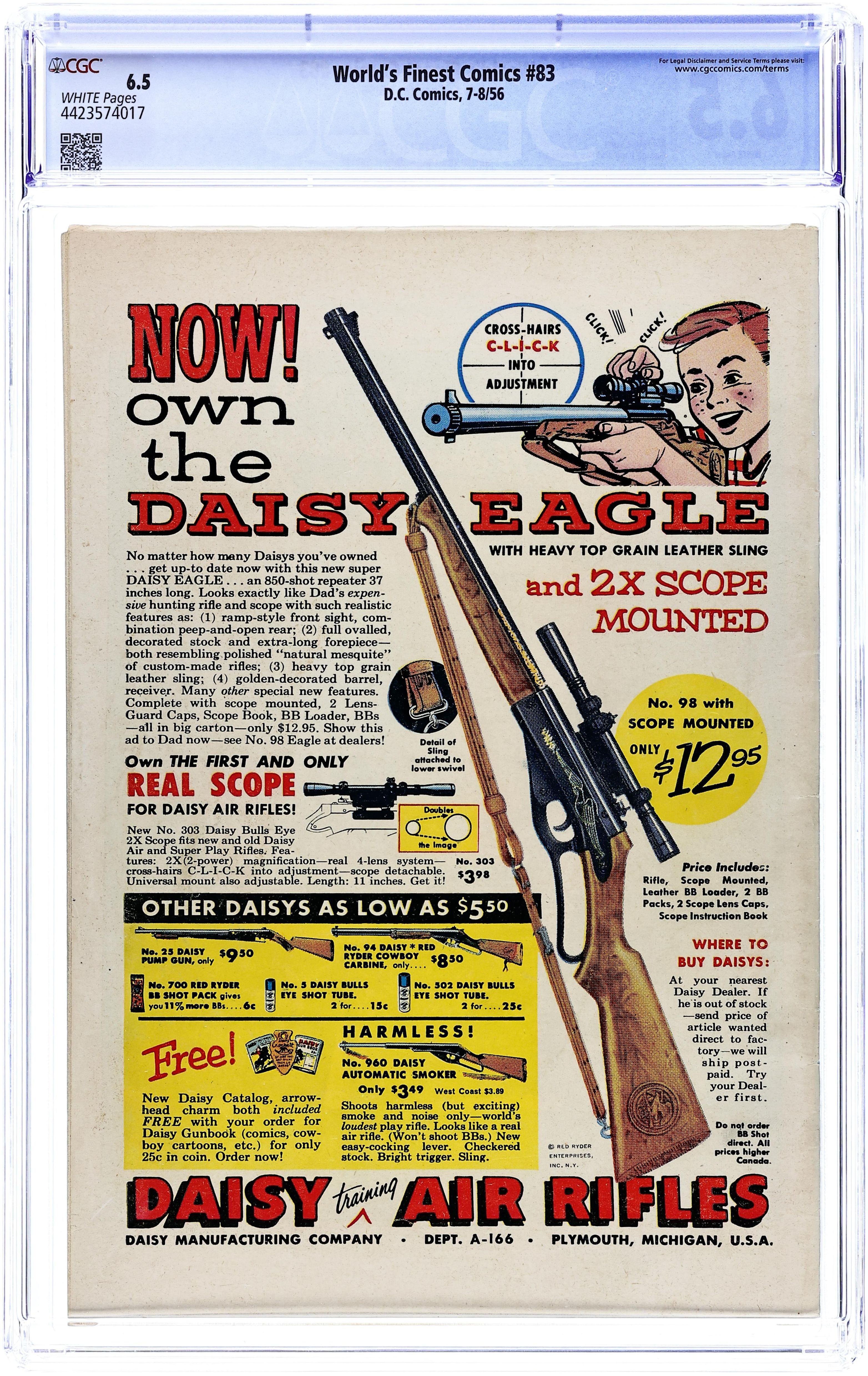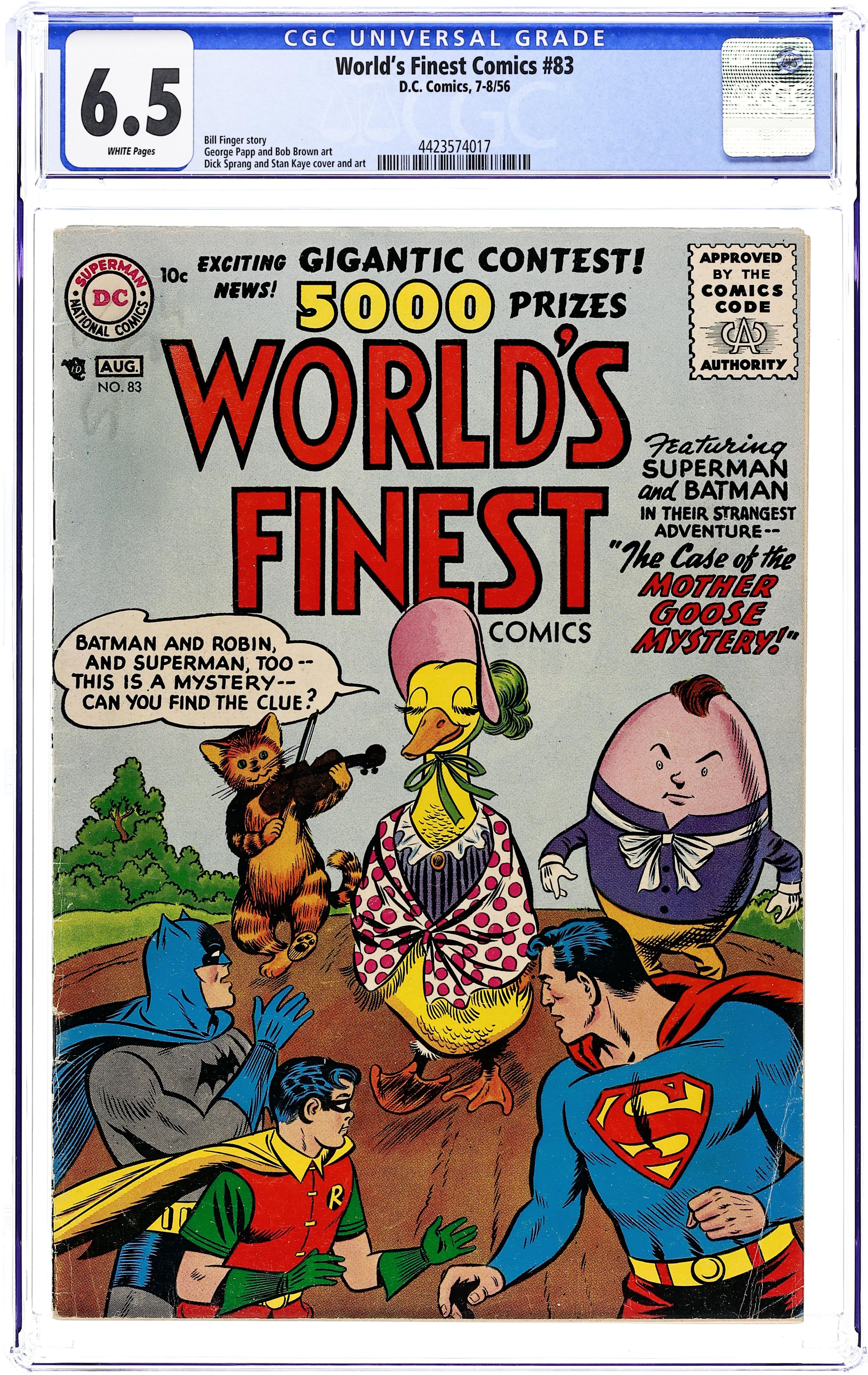 Cover pencils by Dick Sprang, inks by Stan Kaye. The Case of the Mother Goose Mystery, script by Bill Finger, pencils by Dick Sprang, inks by Stan Kaye; Mystery Inc has set up a mystery for three high-paying clients so they can pretend to be Batman, Robin and Superman; A mix-up of dates causes the real superheroes to assume the parts that were to be played by the clients, and stop a real robbery in the process. Shorty humor page by Henry Boltinoff. The Error-Car, art by George Papp; Prof. Weldon Immelwimmer gives Green Arrow a super new arrow car that drives Oliver crazy. Man Overboard text story by Jack Miller [as Joe Maxwell]. The Tribe Without A Chief starring Tomahawk, art by Bob Brown. 36 Pages, Full Color. Cover price $0.10. Grade: CGC 6.5 explanation of grade Condition: Used (collectible)