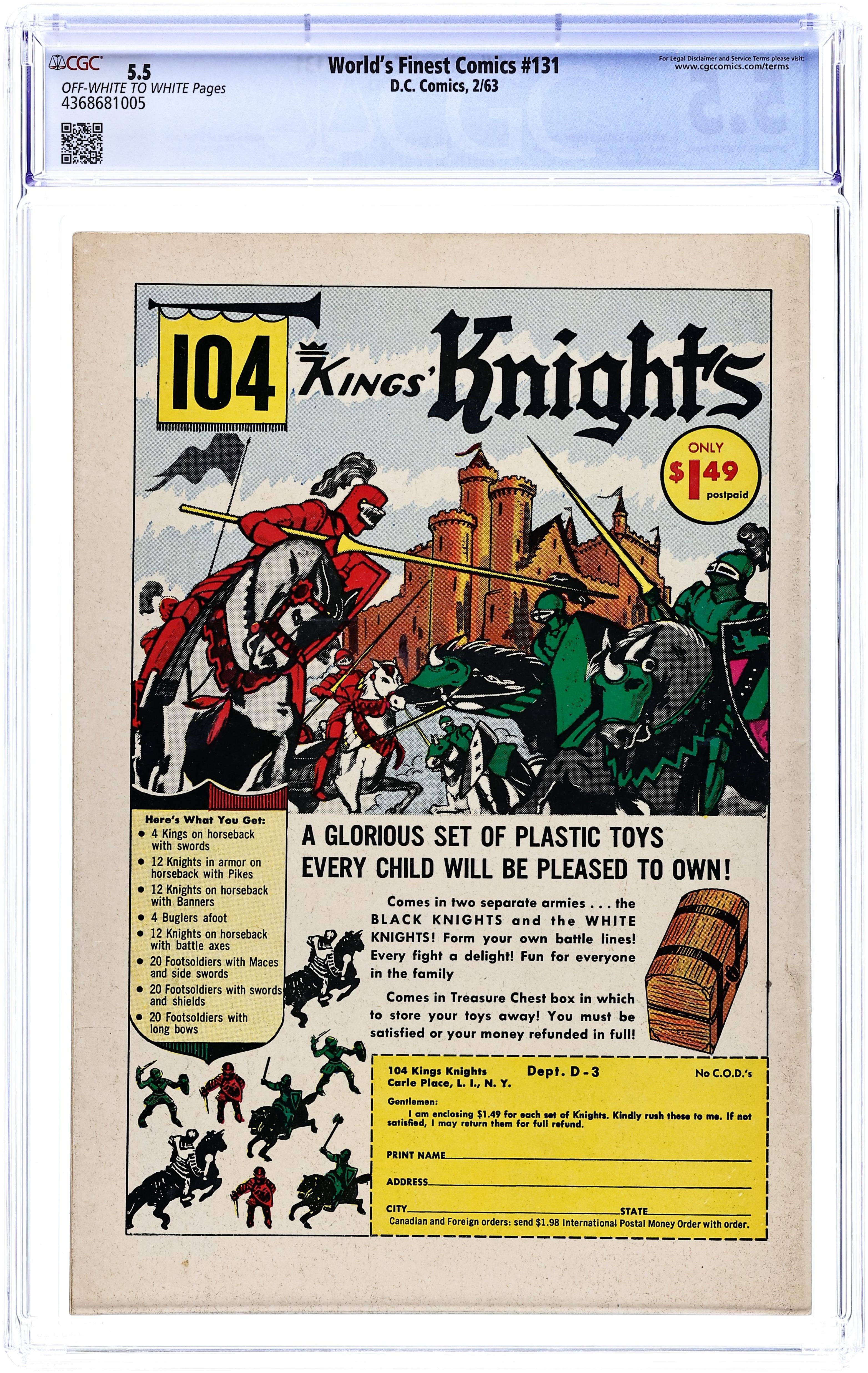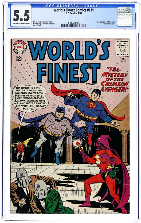 Cover pencils by Dick Dillin, inks by Sheldon Moldoff. The Mystery of the Crimson Avenger starring Superman and Batman, script by Bill Finger, pencils by Dick Sprang, inks by Sheldon Moldoff; The Crimson Avenger tries to help Superman and Batman stop the Octopus Gang but learns that he needs more training. Health Myths Debunked! public service announcement, script by Jack Schiff, art by Sheldon Moldoff. The Man Who Controlled Water starring Aquaman, script by Jack Miller, art by Ramona Fradon. A Cure For Billy Jones, art by Lee Elias; Green Arrow and Speedy take a sick boy out on patrol with them in order to cheer him up. Statement of ownership--average paid circulation 420,000. 36 Pages, Full Color. Cover price $0.12. Grade: CGC 5.5 explanation of grade Condition: Used (collectible)