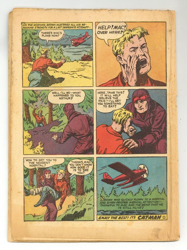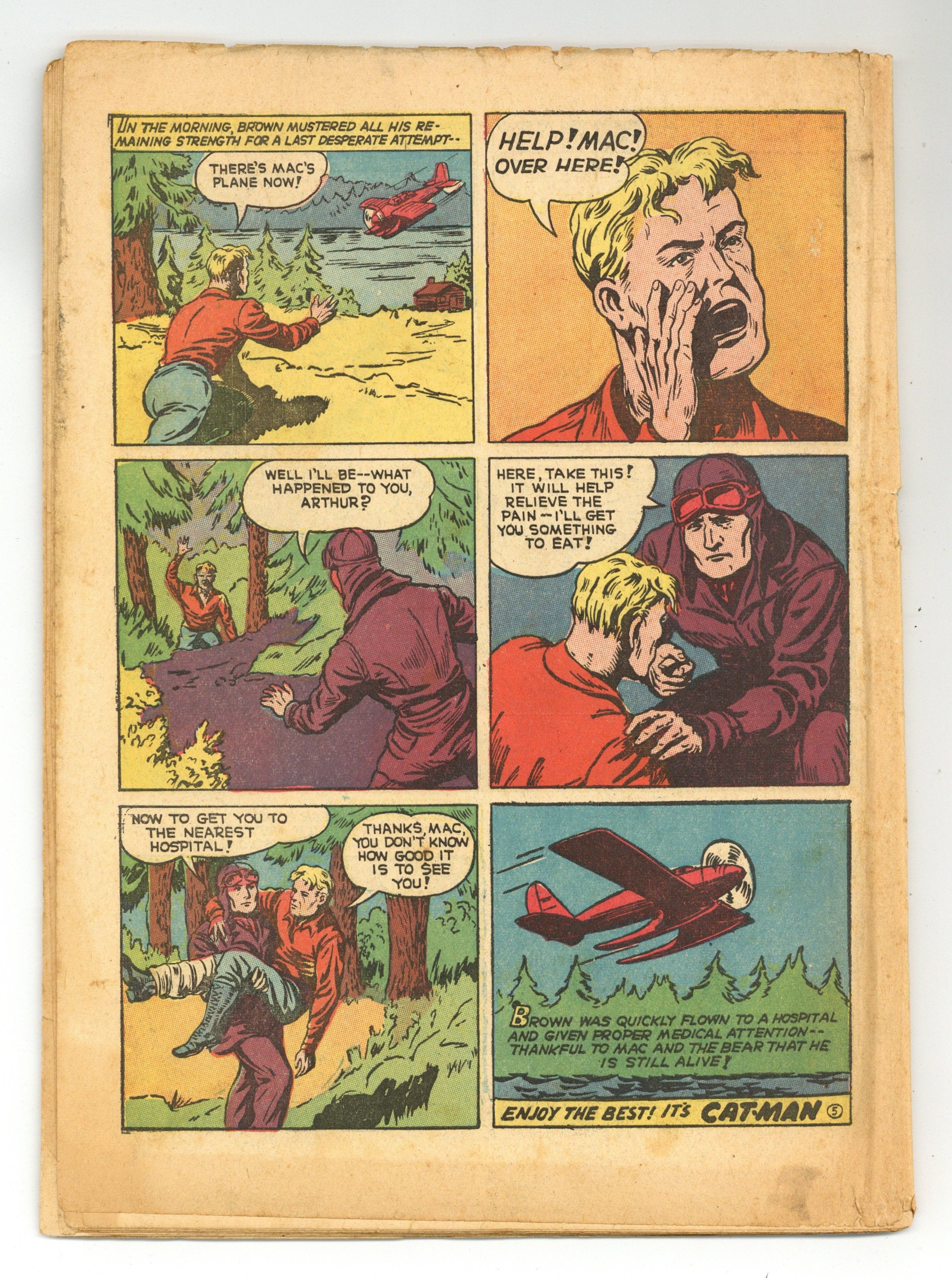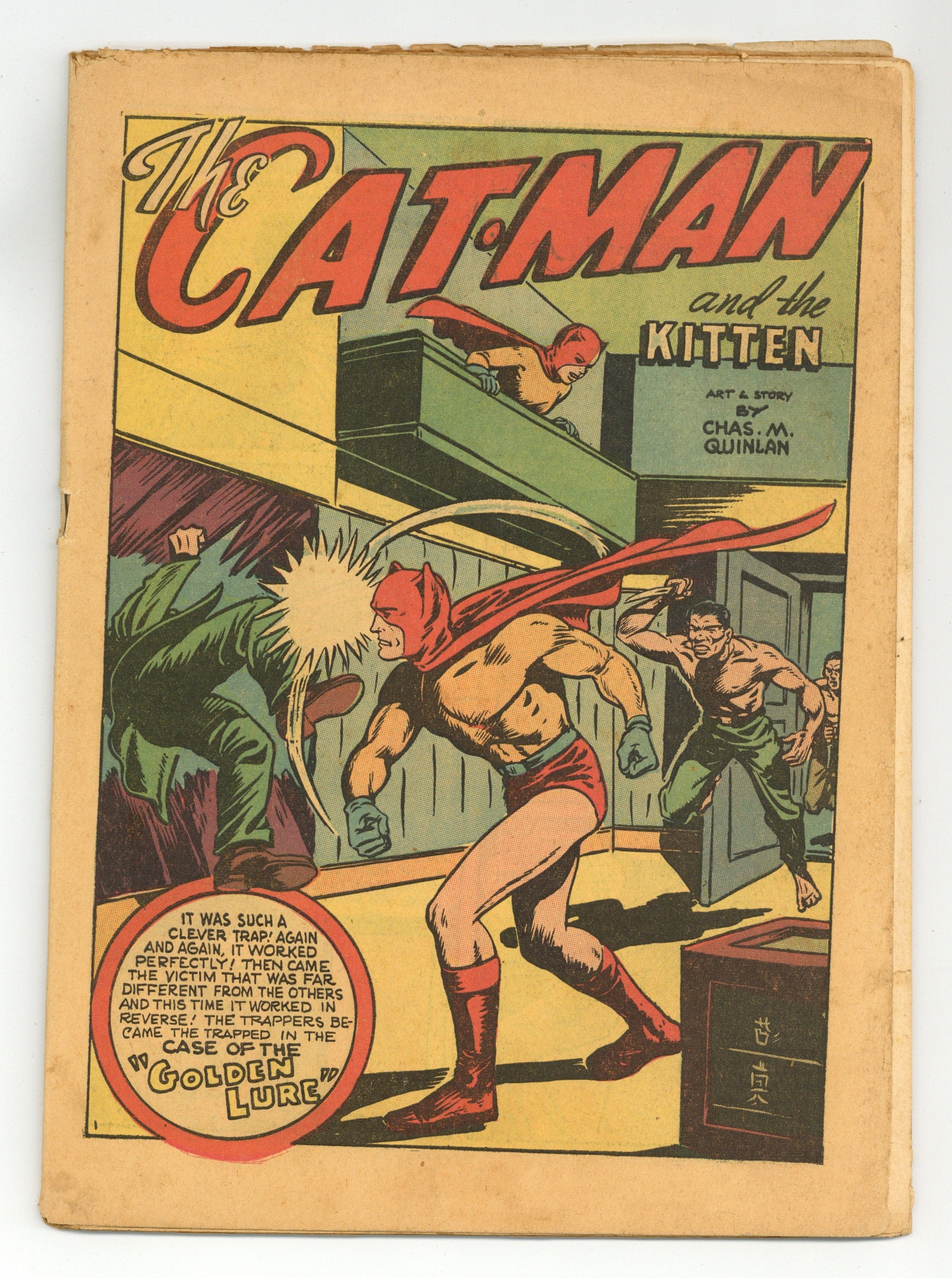 Cover by Charles Quinlan. Stories and art by Bob Fujitani, Charles Quinlan, Herman C. Browner, Robert Turner, Al Mandel and C. R. Schaare. Sometimes listed as Cat-Man Comics Vol. 3 #8. The adventures of Cat-Man and other early superheroes from the Golden Age of comics. Kitten and Mickey, the sidekicks of Cat-Man and the Deacon also known as the Little Leaders, discover Nazis hiding in the suburbs. The Hood faces the magical Death's Head, a decapitated Indian mystic with mind-control powers and a yen to rule the world. Blackout tries to prevent an experimental bomb-sight from falling into Nazi hands. Cat-Man and Kitten: The Golden Lure; The Deacon: The Case of the Right to Ride; Blackout; Rag-Man: The Symbols in Jade; Frank Fairplay's Dangerous Mission; Little Leaders: Cobweb of Blackmail; Pirate Peril; The Hood: The Death's Head!; Terror in the Tropics; A Bear Fact. 56 pages, Full Color. Cover price $0.10. Grade: Coverless explanation of grade Condition: Used (collectible)