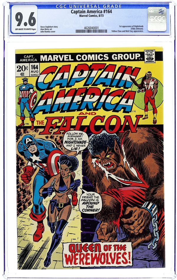 Ended Sep 29 2025 Bid History 7 bids Winning Bid $155 First appearance of Nightshade in "Queen of the Werewolves" Plot by Steve Englehart and Alan Weiss. Script by Steve Englehart. Art by Alan Weiss (with touch-ups by John Romita Sr.). Cover by John Romita Sr. On their way back to New York, the Sentinel of Liberty and the Falcon stop at Grimrock Prison in Maryland to check on Sam Wilson's friend who is serving time there. And unfortunately, the duo is completely unaware of the horror that awaits them inside. Cap enters the facility from the rear and is immediately attacked by werewolves! The star-spangled avenger ferociously fends off the wolf pack and then meets their master: Nightshade! She initially seems harmless -- almost childlike -- but Nightshade enjoys turning people into werewolves...including Sam Wilson! Oh no, will Captain America have to fight the new Falcon-Wolf? Yes, he will. Just like Nightshade planned! Cameo appearances by Nick Fury and the Yellow Claw. (Notes: This is the first appearance of Yellow Claw since the early silver age Yellow Claw (1956) series. A robot version of the character appeared in Strange Tales (1st series) 161-167. Nightshade returns in Captain America 189. Years later she will turn Cap into a werewolf in Captain America 405. Romita's touch-ups to Weiss' pencils create quite a contrast in styles.) 36 pages. Cover price $0.20. Grade: CGC 9.6 explanation of grade Condition: Used (collectible)