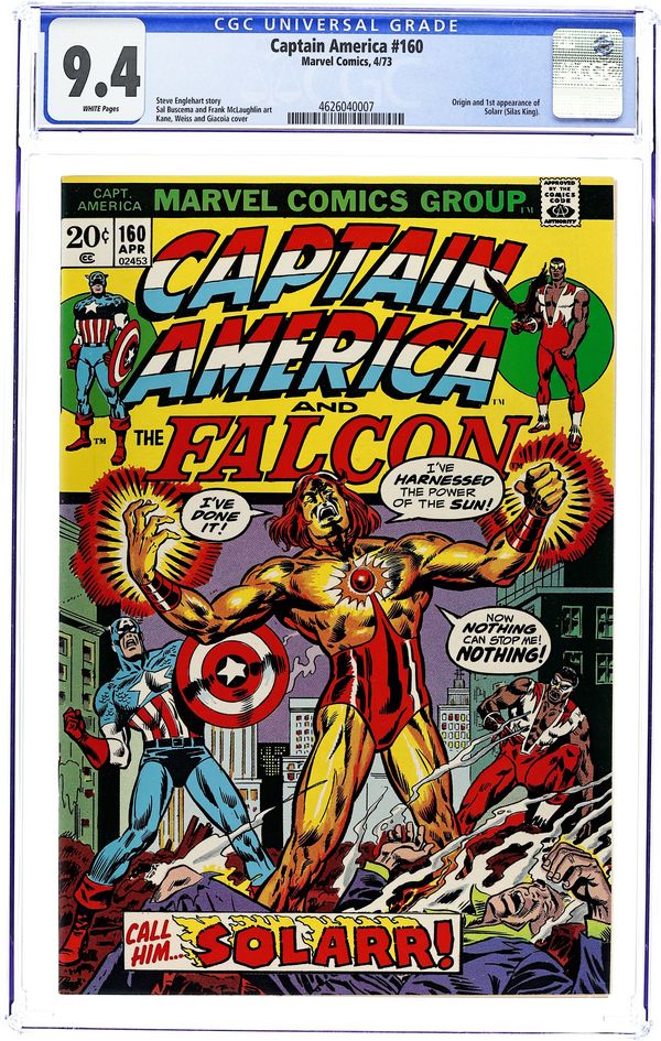 Ended Sep 29 2025 Bid History 13 bids Winning Bid $79 "Enter: Solarr!" First appearance of Solarr. Script by Steve Englehart. Pencils by Sal Buscema. Inks by Frank McLaughlin. Cover by Alan Weiss (pencils), Frank Giacoia (inks), and John Romita Sr. (alterations). A new super-villain bursts on the scene with the power of the sun! Solarr barges into the New York Stock Exchange and robs the venerable institution! And in the process, he kills several innocent bystanders. Fortunately, the star-spangled avenger is in Lower Manhattan this particular afternoon, and he quickly engages Solarr! Will Cap's newfound super-strength lead to victory against his solar-powered foe? In the meantime, the Falcon wonders how he will measure up to his new and improved partner. Origin of Solarr. Cameo appearances by Leila Taylor and Sharon Carter. (Note: Solarr appears next in Avengers 126.) 36 pages. Cover price $0.20. Grade: CGC 9.4 explanation of grade Condition: Used (collectible)