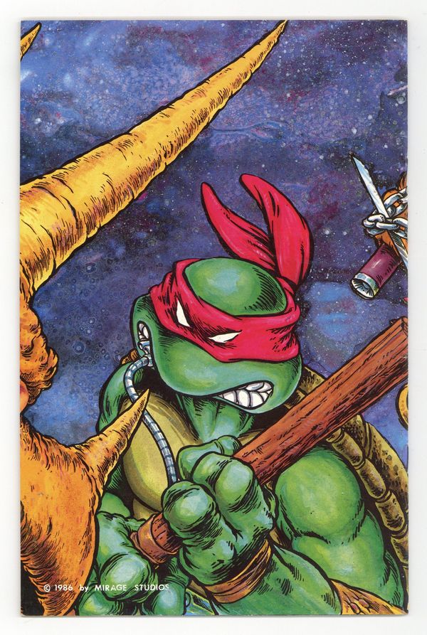 The original series that introduced the Turtles to the world. The Turtles must fight for their lives against Triceraton warriors in a space arena. Story, art and cover by Kevin Eastman & Peter Laird. Black and white; 32 pages. Cover price $1.50. Grade: VF- 7.5 explanation of grade Condition: Used (collectible)