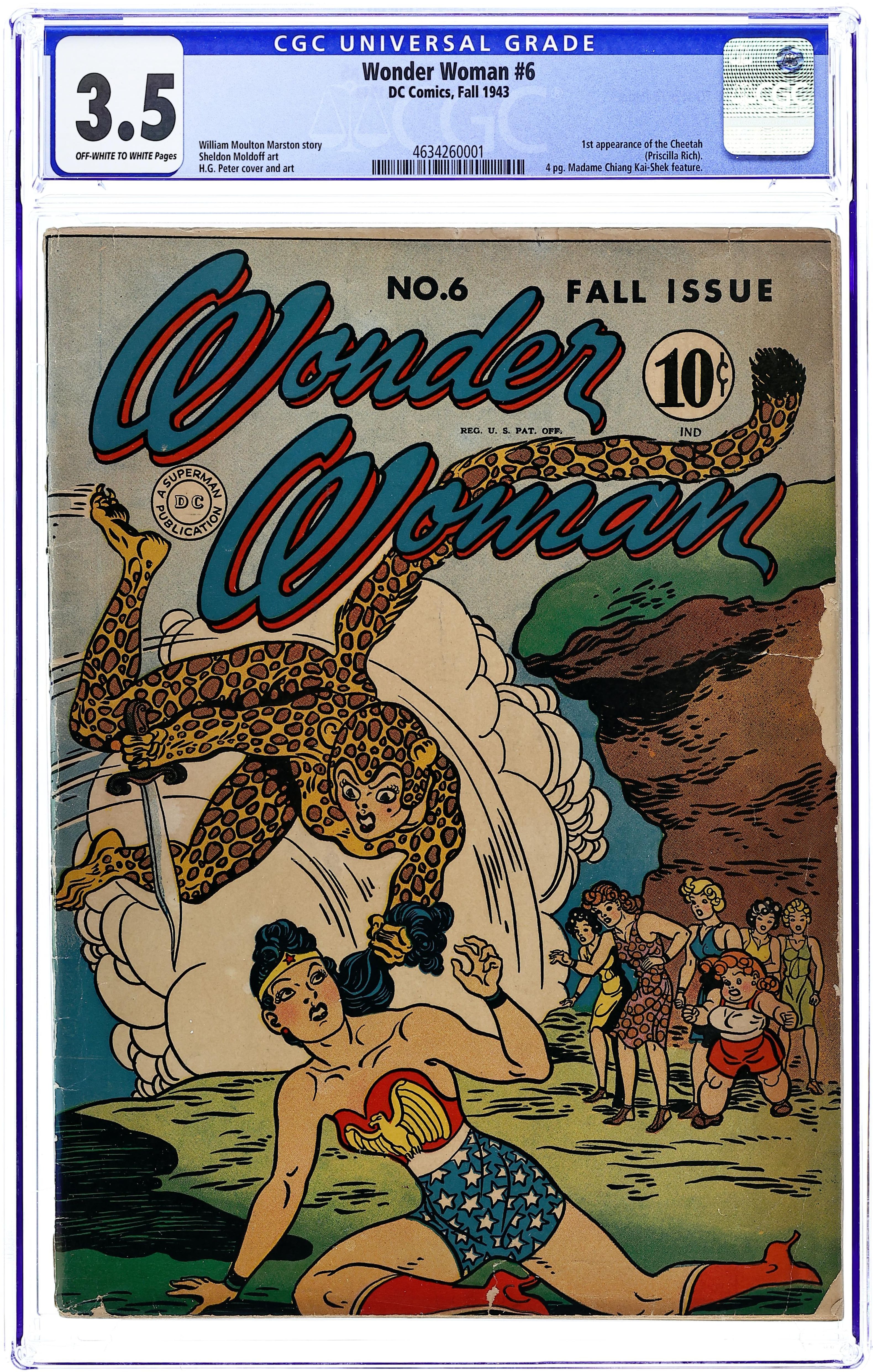 Cover by Harry G. Peter. 1st appearance of the Cheetah in "Wonder Woman and The Cheetah" script by William Moulton Marston (as Charles Moulton), art by Harry G. Peter; Upstaged by Wonder Woman at a charity event, a jealous socialite is overtaken by her evil alter ego, dons a Cheetah hide, and attempts to frame and kill her Amazon adversary. "The Adventure of the Beauty Club," script by William Moulton Marston (as Charles Moulton), art by Harry G. Peter; The Cheetah uses an exclusive beauty club as a front to learn military secrets from soldiers' families; Wonder Woman travels to the Pacific area to stop the Japanese from attacking an American base. "Hop Harrigan and the Radiosonde" text story. Women of History: four-page Madame Chiang Kai-Shek bio, script by Alice Marble, art by Sheldon Moldoff. "The Conquest of Paradise," script by William Moulton Marston (as Charles Moulton), art by Harry G. Peter; The Cheetah crashes a competition between Amazons and man's world girls on Paradise Island, seeking the source of the Amazons' strength to help her defeat Wonder Woman. 60 Pages, Full Color. Cover price $0.10. Grade: CGC 3.5 explanation of grade Condition: Used (collectible)