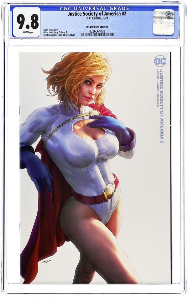 Ended Oct 17 2025 Bid History 11 bids Winning Bid $47 The Syndicate (The 616 Comics, Unknown Comics, Comic Traders, and Street Level Hero) exclusive Minimal Trade Dress Variant Cover by Tiago da Silva. Written by Geoff Johns. Art by Mikel JanÃn. THE NEW GOLDEN AGE CONTINUES! Huntress has arrived in the present day, but the Justice Society of America are not what she remembers. Can she get to the bottom of what's happened to the world's first superhero team? Will the helmet of Fate hold the answers Huntress seeks? 32 pages, full color. Rated Teen+ Grade: CGC 9.8 explanation of grade Condition: Used (collectible)