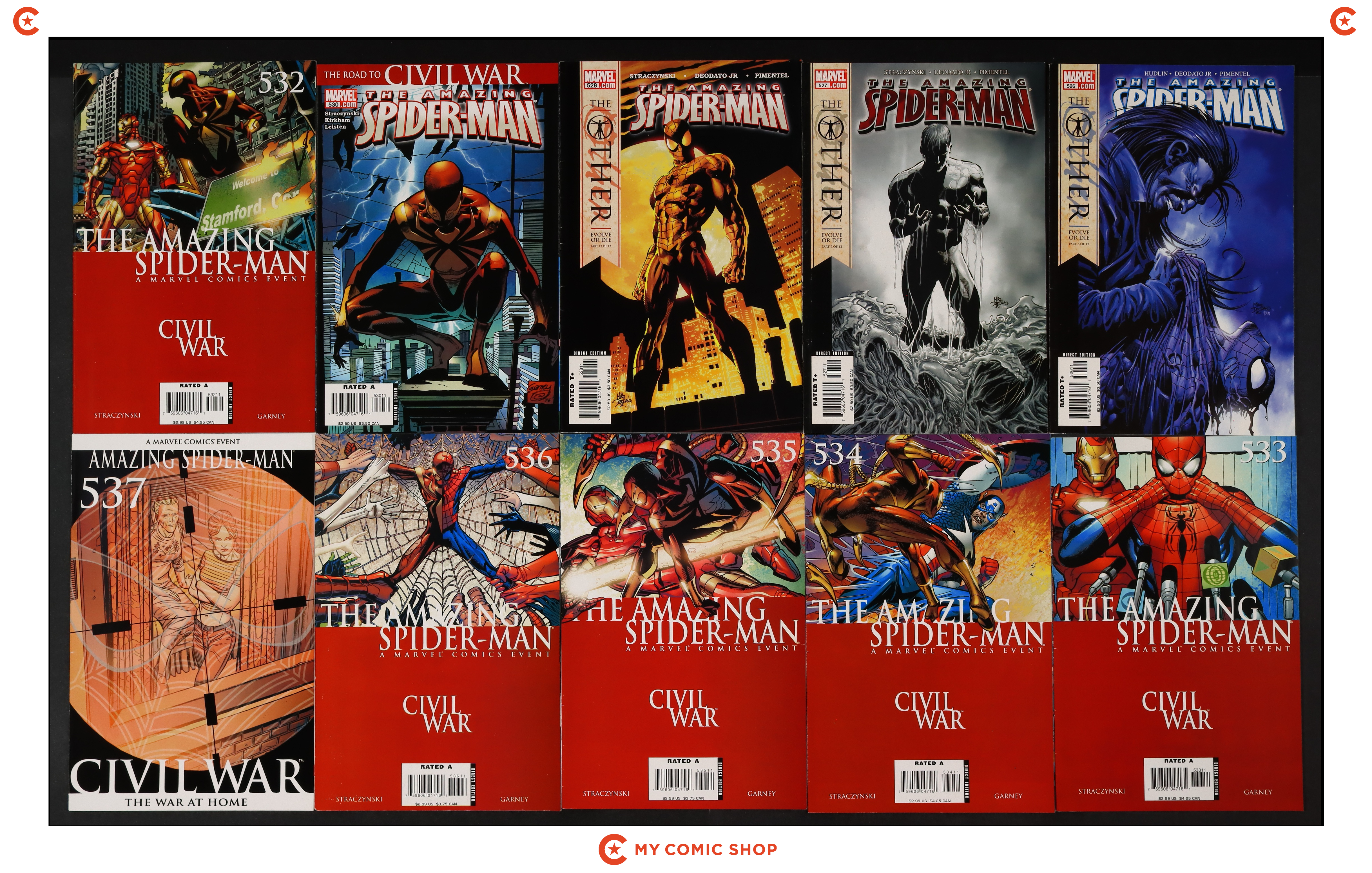 Issues 526A, 527A, 528A, 530, 532, 533A, 534, 535, 536, 537B of Amazing Spider-Man (1998 2nd Series). Most will grade in the VG to FN range.