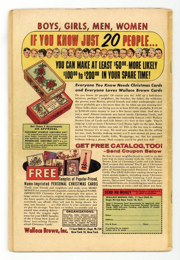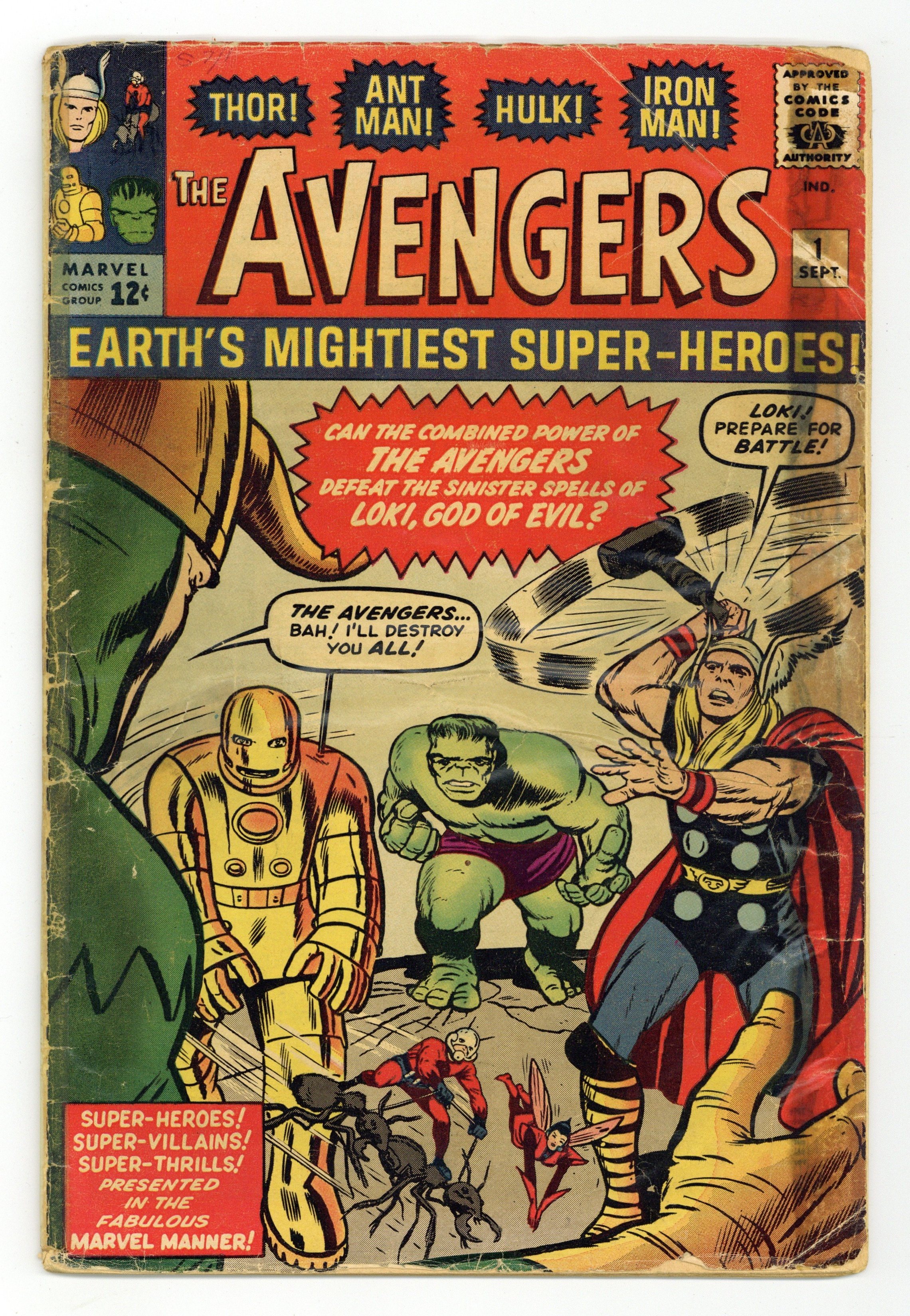 Cover pencils by Jack Kirby, inks by Dick Ayers. In this first landmark issue, Thor, Hulk, Iron Man, and Ant Man form the Avengers in "The Coming of the Avengers!", script by Stan Lee, pencils by Jack Kirby, inks by Dick Ayers; Loki, having been previously captured by Thor, is being held prisoner at the Isle of Silence in Asgard; His physical form may be confined there, but by means of thought projection his disembodied self travels to Earth in search of revenge; He spots Thor in his human identity of Dr. Don Blake, but resists defeating him as it would be a hollow victory compared to defeating him as Thor; After hours of searching, Loki happens across the Hulk and devises a wicked plan to entice Blake to transform into Thor; Hours later, newspapers print articles about the Hulk being on the rampage again and a manhunt begins; The Hulk's friend, Rick Jones, reads the article with disbelief and meets with members of the Teen Brigade in order to find help to track Hulk down to find the truth; They attempt to contact the Fantastic Four but Loki interferes with the radio signal, diverting it to Don Blake; He decides to transform into Thor to help the Teen Brigade; Unknown to Loki, the radio signal is also picked up by Ant-Man, the Wasp, and Iron Man, who also travel to assist; Iron Man, Ant-Man and the Wasp pursue the Hulk to an auto factory in Detroit; Thor appears with Loki to clear Hulk's name; Suddenly Loki makes himself radioactive forcing the heroes to retreat; Luckily, Loki stands over a trapdoor and Ant-Man's ants trigger a switch, dropping him into a lead-lined tank; Upon celebrating their victory, Ant-Man and the Wasp point out how well they could work as a team, and that they should work together in future; The Wasp decides they should call themselves the Avengers, and everybody agrees. 36 pgs., full color. $0.12. Cover price $0.12. Grade: GD- 1.8 explanation of grade Condition: Used (collectible)