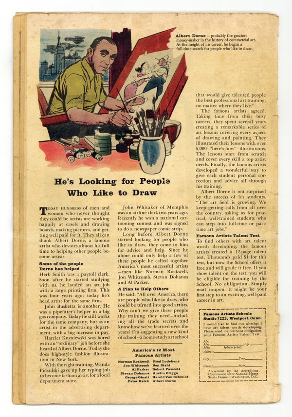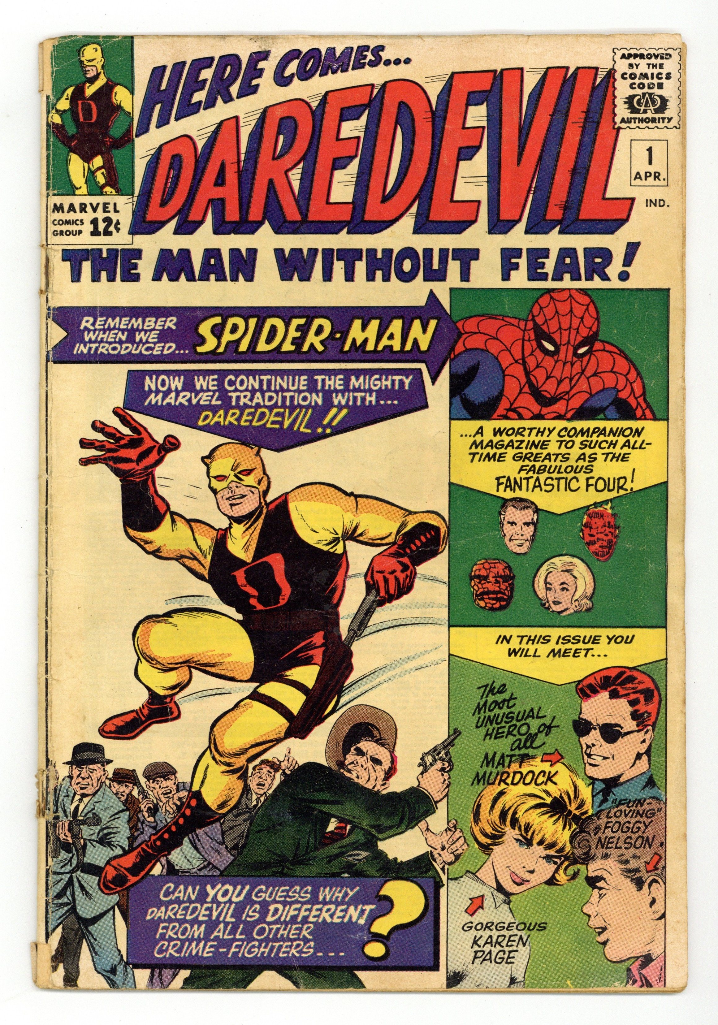 Cover pencils by Jack Kirby, inks by Bill Everett. First appearances of Daredevil, Karen Page, and Foggy Nelson in The Origin of Daredevil, script by Stan Lee, art by Bill Everett (splash page penciled by Jack Kirby); Matt Murdock saves a blind man from an oncoming truck but is struck blind himself by a radioactive canister during the rescue; The radioactivity heightens Matt's other senses and gives him an uncanny radar sense; Matt graduates college and begins practicing law with his college roommate Foggy; Matt's father, a boxer, is killed by the Fixer after he refuses to throw a fight; Matt designs a costume and a billy club (from his cane) and takes his derogatory childhood nickname "Daredevil"; DD tracks down the Fixer and the man who shot his father. Spider-Man and Fantastic Four appear on the cover but not in the story inside. 36 pgs. Cover price $0.12. Cover price $0.12. Grade: GD+ 2.5 explanation of grade Condition: Used (collectible)