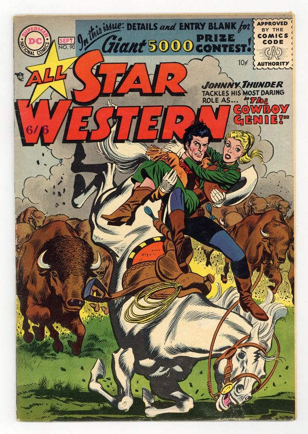 Ended Oct 27 2025 Bid History 4 bids Winning Bid $17 Edited by Julius Schwartz. Cover by Gil Kane and Joe Giella. Written by Robert Kanigher, Gardner Fox and John Broome. Art by Gil Kane, Ross Andru, Jerry Grandenetti, Howard Sherman and Mike Esposito. Johnny Thunder tackles his most daring role as..."The Cowboy Genie!" by Robert Kanigher and Gil Kane. Also in this issue: The Trigger Twins in "The Secret of Silver Lake!" by Robert Kanigher, Ross Andru and Mike Esposito; Strong Bow in "The Adventure of the Shrinking Bow" by Gardner Fox and Jerry Grandenetti; and Foley of the Fighting 5th in "The Gun-Runner of Elk River!" by John Broome and Howard Sherman. Plus: Indian Tribal Names half-pager and 2-page article "The Capture of Bill Doolin"! 32 pages, full color. Cover price $0.10. Grade: VG- 3.5 explanation of grade Condition: Used (collectible)