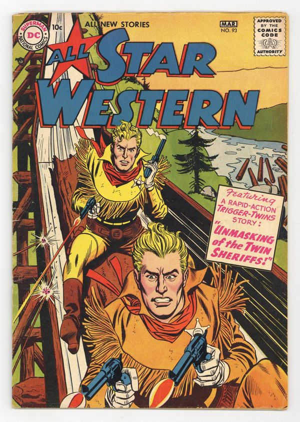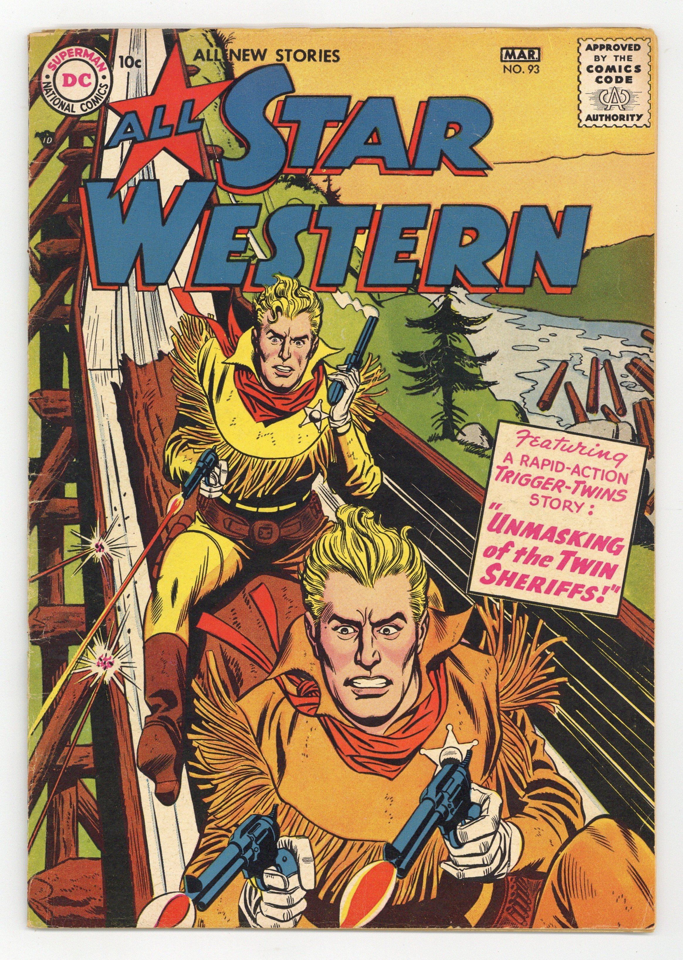Ended Oct 27 2025 Bid History 4 bids Winning Bid $9 Edited by Julius Schwartz. Cover by Gil Kane and Joe Giella. Stories by Robert Kanigher, Carmine Infantino, Joe Giella, France Herron, Jerry Grandenetti, John Broome, Howard Sherman, and Gil Kane. Tales of the Old West starring such characters as the Trigger Twins, Strong Bow, Foley of the Fighting 5th, and Johnny Thunder. Curious Names of Western Mines article by Julius Schwartz, art by Morris Waldinger and Tommy Nicolosi. Prince of Pistoleers non-fiction story starring Wild Bill Hickok, script and art by Mort Drucker. Western Weather article byJack Miller, art by Raymond Perry. 36 pages, full color. $0.10. Cover price $0.10. Grade: VG- 3.5 explanation of grade Condition: Used (collectible)