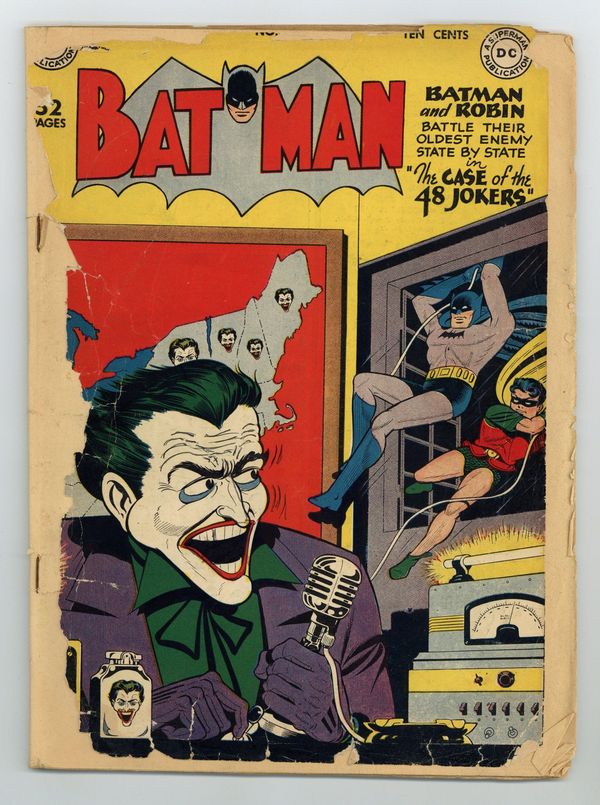 Ended Oct 13 2025 Bid History 30 bids Winning Bid $294 Cover pencils by Dick Sprang, inks by Charles Paris. The Case of the 48 Jokers!, script by Bill Finger, pencils by Dick Sprang, inks by Stan Kaye; The Joker starts his own criminal school; He prepares thugs from 48 States to become part of a large network of criminals; Batman and Robin learn of the cross-country crimes and confront the Joker in his base of operations. Bruce Wayne, Rookie Policeman!, pencils by Bob Kane, inks by Charles Paris; Bruce Wayne agrees to carry on the honorable work of a dying policeman; He becomes a member of the Gotham City Police Department, but his duties create conflict with his work as Batman. One-page Fluffy story by Phil Berube. Stay in School -- Give Yourself a Chance public service announcement starring Buzzy, script by Jack Schiff, art by Bob Oksner. It's Your Future text story, art by Raymond Perry. Half-page Casey the Cop story by Henry Boltinoff. The Bandit of the Bells!, pencils by Bob Kane and Charles Paris, inks by Charles Paris; Batman and Robin must prevent the crimes of Gong, controls every kind of bell; When he steals a particularly valuable bell, Batman investigates. 52 Pages, Full Color. Cover price $0.10. Grade: PR 0.5 explanation of grade Condition: Used (collectible)