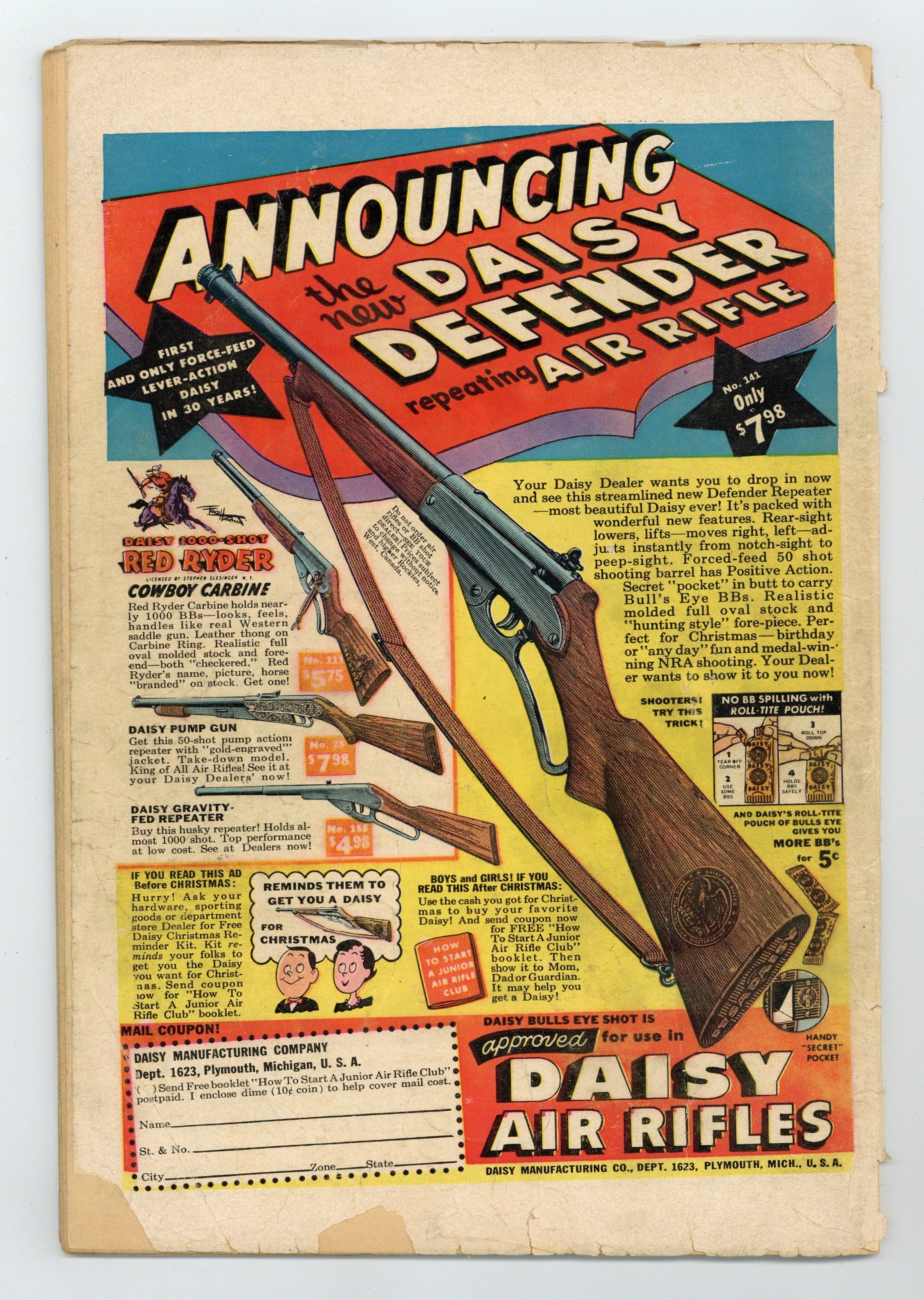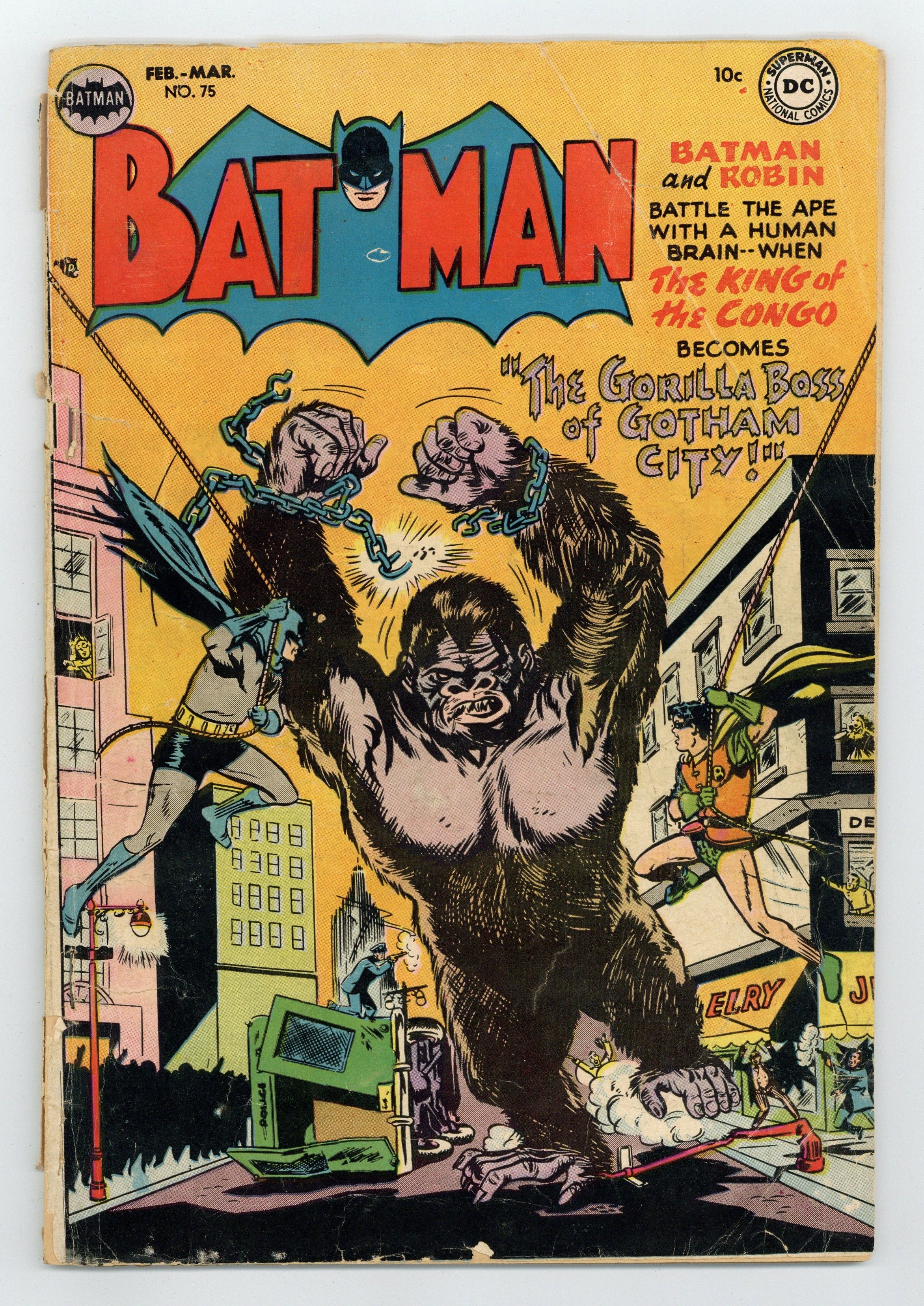 Ended Oct 13 2025 Bid History 20 bids Winning Bid $161 Gorilla story issue! Cover by Win Mortimer (Batman and Robin figures only) and Lew Sayre Schwartz. The Holiday Spirit! public service announcement with Superboy, script by Jack Schiff, art by Win Mortimer. "Outlaw Town, U.S.A.!", script by David Vern, pencils by Dick Sprang, inks by Charles Paris; The town of Silver Vein is run by criminals and is a hideout for bad guys;. When some criminals from Gotham City go to Silver Vein, Batman and Robin follow them. Half-page Little Pete story by Henry Boltinoff. "Mr. Roulette's Greatest Gamble," script by David Vern, pencils by Dick Sprang, inks by Charles Paris; Mr. Roulette has been gambling with his life but Batman and Robin try to stop him. One-page Casey the Cop story by Henry Boltinoff. "Stone Walls and Iron Bars" article by Jack Miller, art by Raymond Perry. Half-page Jerry the Jitterbug story by Henry Boltinoff. "The Gorilla Boss of Gotham City!", script by David Vern, pencils by Bob Kane (Batman and Robin figures only) and Lew Sayre Schwartz (as Bob Kane), inks by Charles Paris; Boss Dyke is executed in the gas chambers for his crimes, and his body is taken to a doctor who transplants the criminal's brain into that of a large gorilla; The gorilla communicates to the doctor that after he and his gang have secured needed funds, he wants his brain then transplanted into that of the Batman, and Batman's brain put into the gorilla. 44 Pages, Full Color. Cover price $0.10. Grade: FR 1.0 explanation of grade Condition: Used (collectible)