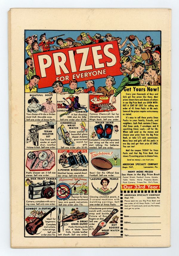 "The Evil Eye," art by Bill Everett; Prof. Lyle Chambers summons a gigantic, floating eye from outer space, which has the power to shoot death rays and blow up buildings merely by looking at them; Chambers' idea is to force the government to make him the dictator of America in exchange for removing the destructive force, but the eye eventually turns on him and blasts him into nothingness. "Dial...City Morgue!", art by Sol Brodsky; Our protagonist, Ted, uses his new phone in an attempt to call a business rival, but instead hears a mysterious voice saying "City Morgue!"; Just ten minutes later, Ted's rival dies in a hit-and-run killing. "Sculpture of Death" text story. "It!", art by John Romita; Bill and Jenny, a young married couple, adopt a baby, but they are soon plagued by a mysterious series of accidents, including a poisoned mug of coffee and a house fire; Jenny trips over the baby's teddy bear and falls down the stairs to her death; the story is a swipe of Ray Bradbury's "The Small Assassin." "The Man on the Beach!", art by Bill LaCava; While walking on the beach, a young couple encounters a ragged beachcomber who claims that the world is doomed; He explains that he used to be a clumsy and inept bookkeeper named Robert Gordon who was transported 5,000 years into the future as part of a scheme to save the world. 36 pgs., full color. Cover price $0.10. Grade: GD+ 2.5 explanation of grade Condition: Used (collectible)
