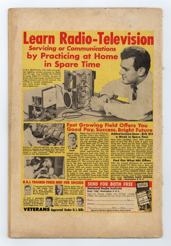 Cover art by Bill Everett. "The Laundry Machines!", art by Paul Reinman; A landlord squeezes a Haitian laundress for more rent and is made ill by voodoo; He has her deported, but the box holding the pills to cure him contains only more boxes, one within the next. "The Spectre," art by Dick Giordano; A race car driver refuses to drive after he sees a ghost; His manager thinks it is a hallucination, and pays a mystic to convince him it is safe. "The Miracle Painting" text story, art by Doug Wildey. "The Disappearing Man!", art by Ed Winiarski; A scientist who disappeared years ago returns, explaining that he is now king of an alternate dimension His greedy friend hopes to take over the dimension for himself, but ends up imprisoned indefinitely. "Menace of the Mirror," art by Bernard Baily; A scientist thinks he has invented a machine to give life to reflections in a mirror, but when he tests it he realizes that he himself is a reflection. "Fear Walks on Four Feet!", art by Al Eadeh; A man tries to ruin his partner and romantic rival; He overpowers a ray intended to capture a lion and it explodes; He seems to be blown into the past and hides for a year. "The Eyes That Never Close!", art by Bernie Krigstein; A prisoner tries to escape using a mystic idol, but it will only take the evil on doomed journeys through time, and he is trapped in Hiroshima just before the bomb falls. 36 pgs., full color. Cover price $0.10. Grade: FR/GD 1.5 explanation of grade Condition: Used (collectible)