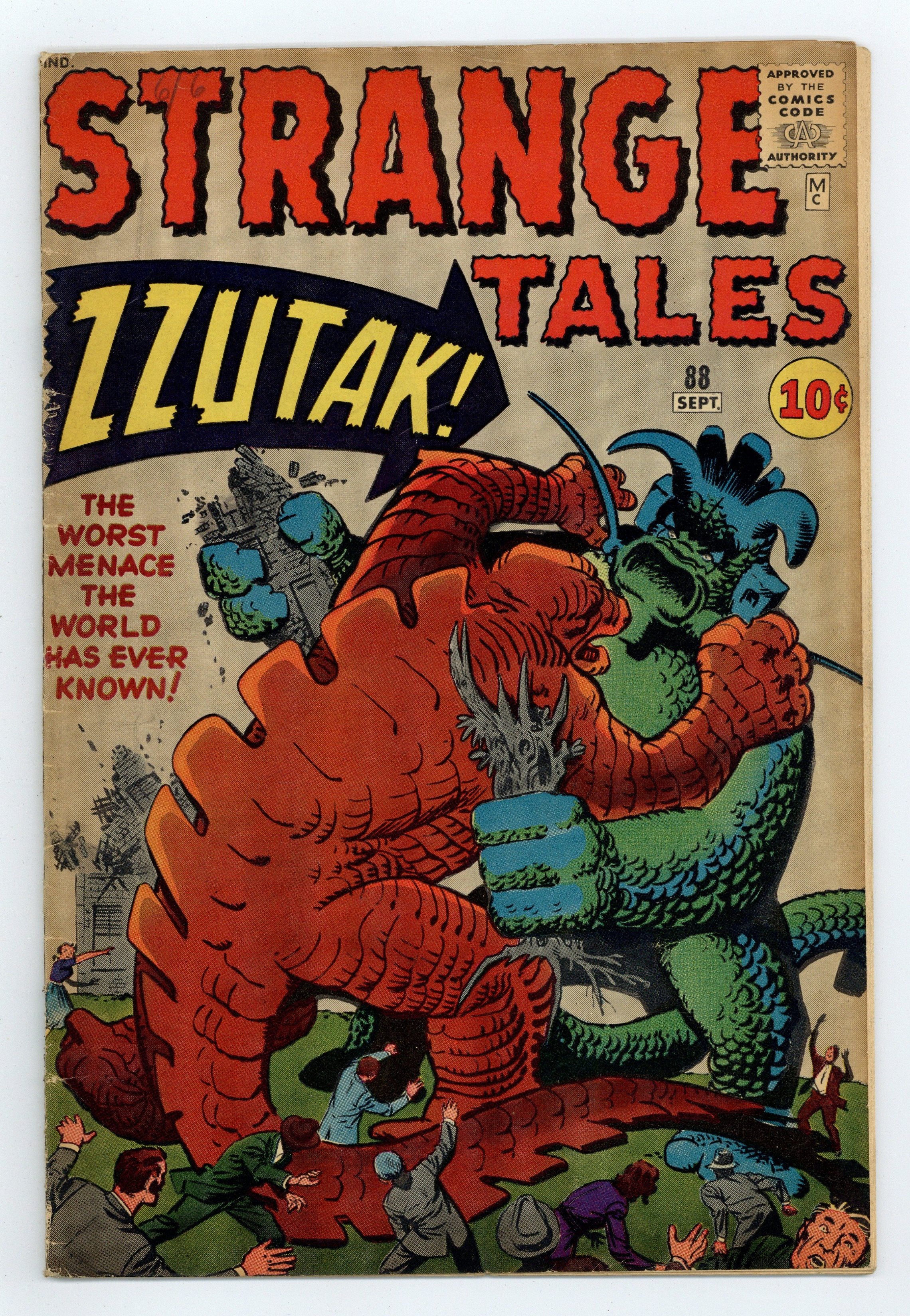 Cover pencils by Jack Kirby, inks by Steve Ditko. "Zzutak the Thing That Shouldn't Exist!!", pencils by Jack Kirby, inks by Steve Ditko; An American comic book artist is forced by an Aztec priest to make a monster with magic paints; The artist creates another monster to fight the first, causing the temple to collapse on both monsters. "Snowstorm" text story. "The Lifeless Man!", art by Steve Ditko; A young boy prefers an old wooden toy soldier to more modern toys; His friends make fun of the toy, but when they are threatened by a bear the soldier seems to drive it off with its rifle. "Punishment!", art by Don Heck; An advanced civilization sends a mugger to a prison planet; Only a few moments on this world full of war, crime and disease make him go straight in order to avoid ever again coming back to Earth. 36 pgs., full color. Cover price $0.10. Grade: VG- 3.5 explanation of grade Condition: Used (collectible)