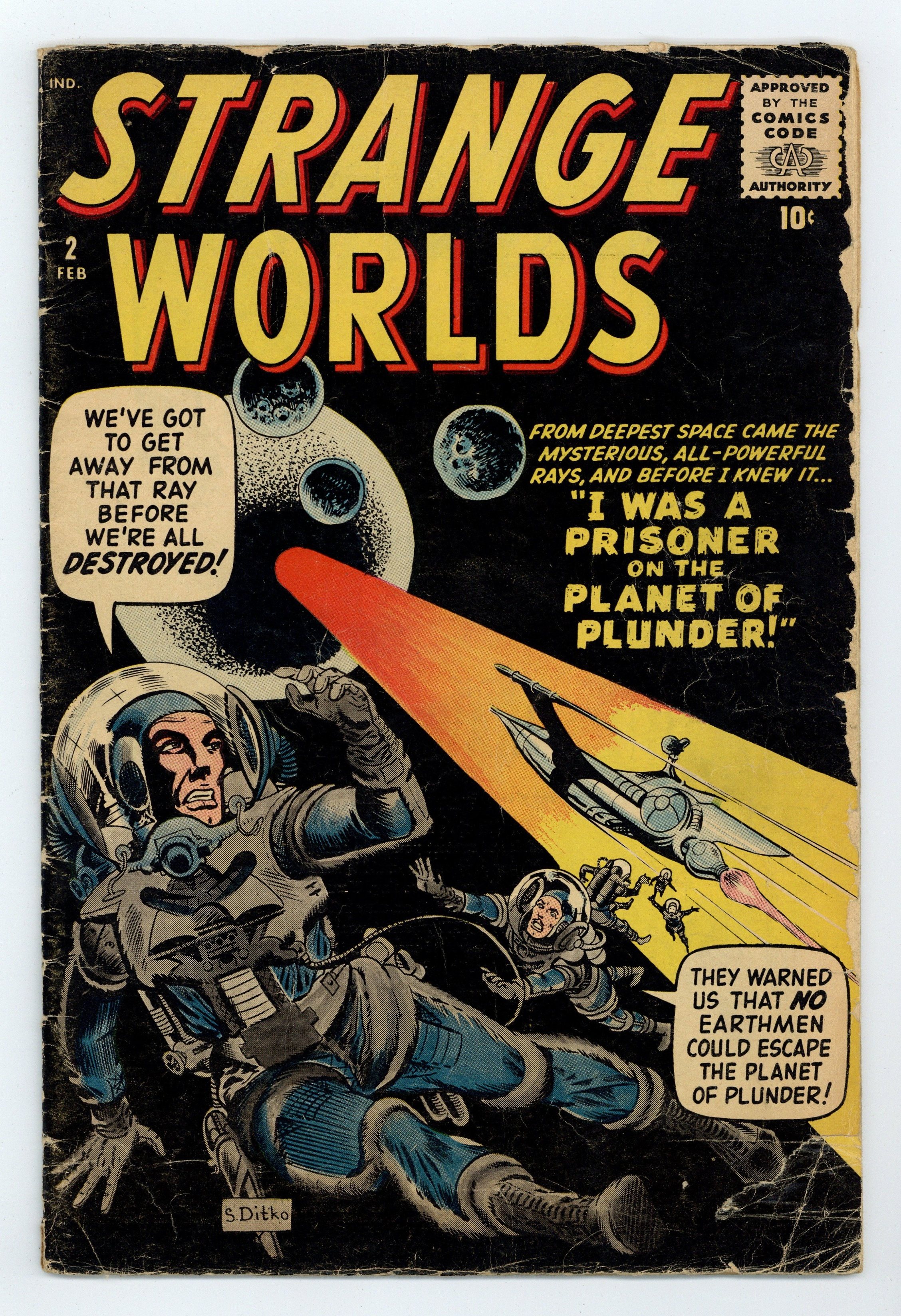 Cover by Steve Ditko. "I Was a Prisoner on the Planet of Plunder!", art by Don Heck; An interstellar detective takes a cargo pilot's place to find out how ships are being robbed without anyone remembering anything. "Strange Mission" text story, art by Joe Maneely. "I Was the Miracle Man"; A brilliant but cruel businessman sets out to conquer an alien world. "I Saw the Day the World Ended!"; A machine seems to show the end of the world when the Sun burns out in the future. "The Little Lost Planet," art by Steve Ditko; A tiny lost planet does good deeds on Earth until it is located by its mother planet and returned to its home galaxy. "I Am the Scourge of Atlantis!", art by Dick Ayers; The king of Atlantis is convinced that life still exists on the surface and leads an invasion fleet to make war on the world above. 36 pgs., full color. $0.10. Cover price $0.10. Grade: GD 2.0 explanation of grade Condition: Used (collectible)