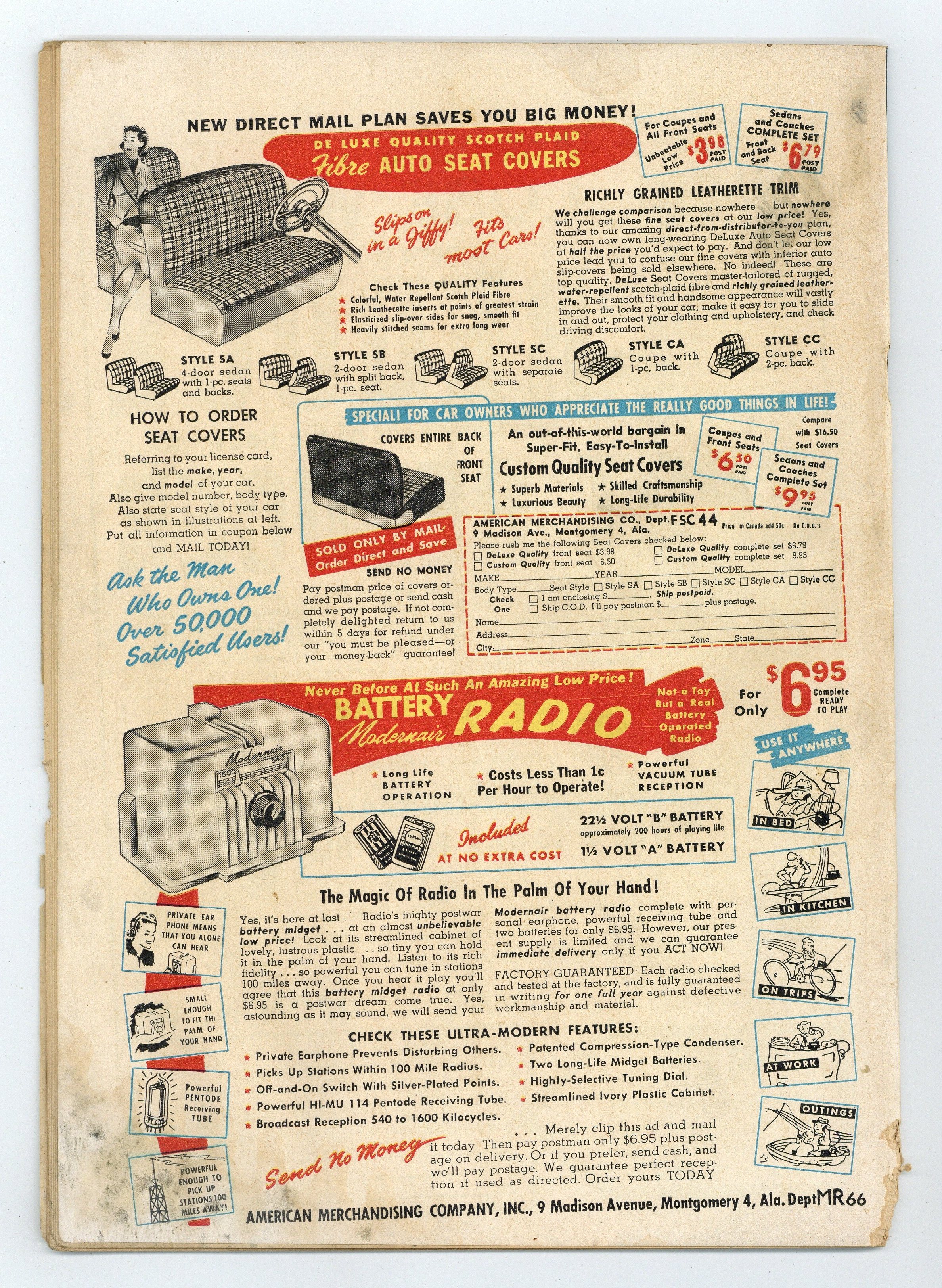 Cover art by Syd Shores. Murder Motor Mart starring Sub-Mariner and Namora, script and art by Bill Everett. Framed For Crime starring the Blonde Phantom, pencils by Mike Sekowsky. Terror In the Lost Colony starring the Sub-Mariner and Namora, pencils by Bob Powell, inks by Ken Bald. 36 pgs. $0.10. Cover price $0.10. Grade: GD- 1.8 explanation of grade Condition: Used (collectible)