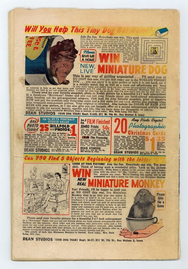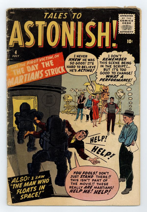 Cover by Jack Kirby and Christopher Rule. I Was a Prisoner of the Martians!, art by Joe Sinnott; A bullying director is kidnapped by Martians using the science fiction movie he's filming as a cover. Masquerade text story. My Forbidden Paintings!, art by Don Heck; A painter buys a magic brush with the power to make three paintings become real. He makes himself handsome and a famous painter. I Made Time Stand Still; An inventor accidentally makes time stand still, leaving himself the only person able to move. I Love a Mermaid!, art by Carl Burgos; A man always drawn to the sea falls in love with a mermaid. The Man Who Floats in Space!, art by Steve Ditko. 36 pgs., full color. $0.10. Cover price $0.10. Grade: FR/GD 1.5 explanation of grade Condition: Used (collectible)