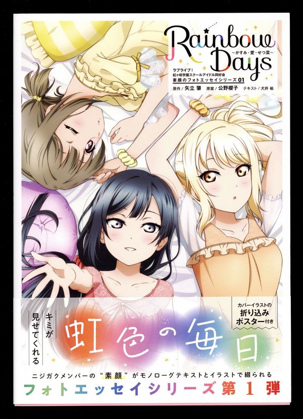 1st printing. All text in Japanese. Love Live! Nijigasaki High School Idol Club: Sunao no Photo Essay Series 01: Rainbow Days - Kasumi & Ai & Setsuna. Features stories by Sakurako Kimino and writer Nire Inui focusing on each of the girls that give fans a look at their true, honest selves through three essays with accompanying illustrations. Also included is an insert poster of the cover illustration! Softcover, 64 pages, full color, Japanese language. Grade: NM- 9.2 explanation of grade Condition: Used (collectible)