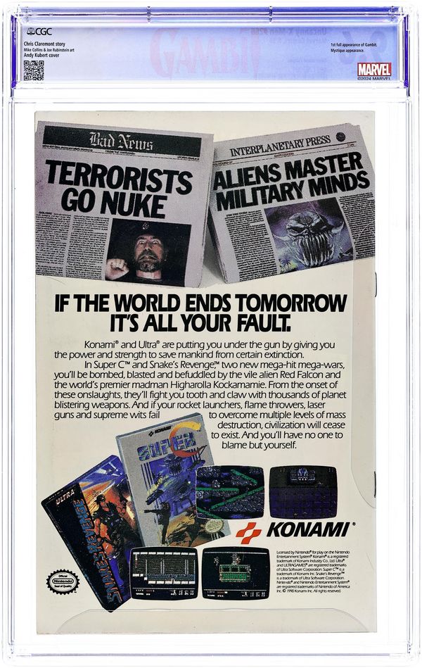 Ended Oct 16 2025 Bid History 22 bids Winning Bid $293 Newsstand Edition. "Gambit!" Part 2 of 3. Story by Chris Claremont. Art by Mike Collins and Joe Rubinstein. Cover by Andy Kubert. The Hounds are closing in on the young thief named Storm. Her only hope may lie in the hands of a mysterious and charming stranger. Plus, the Shadow King wants Mystique dead. NOTE: 1st appearance of Gambit. 36 pages, full color. Cover price $1.00. Grade: CGC 9.6 explanation of grade Condition: Used (collectible)