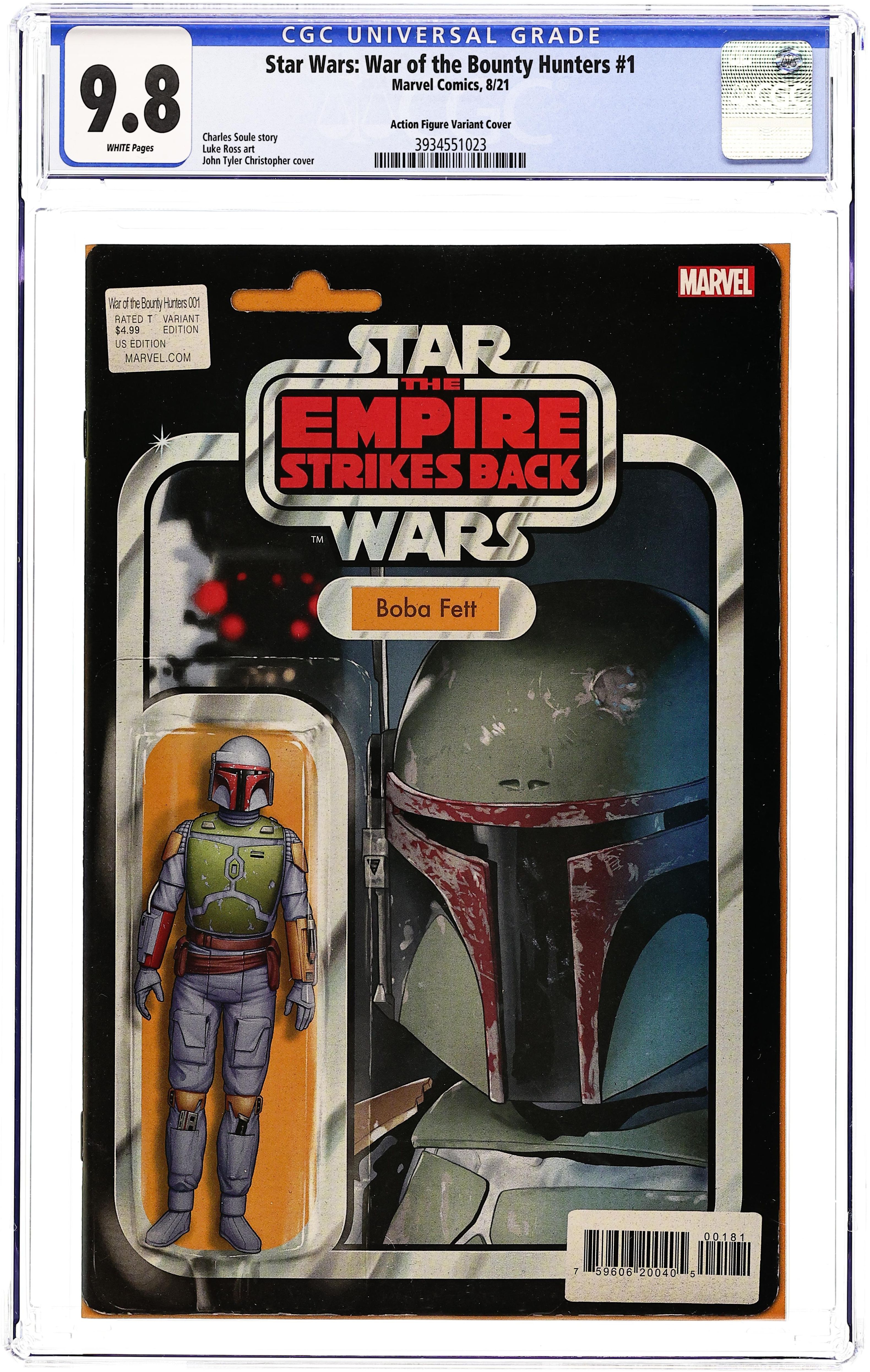 Written by Charles Soule. Art by Luke Ross. Cover by John Tyler Christopher. AT WAR FOR THE GREATEST PRIZE OF ALL: HAN SOLO! THE HUNT BEGINS! Nobody. Steals. From BOBA FETT! The notorious bounty hunter will not stop until he gets what's rightfully his. For the thief, no corner of the galaxy is safe. Good thing for them that the REBEL ALLIANCE, THE EMPIRE and every bounty hunter in the galaxy is standing in Boba's way. With a last-page reveal that will blow this Death Star-sized story wide open, Issue #1 is just the beginning. The biggest crossover in STAR WARS history will continue raging through the pages of the WAR OF THE BOUNTY HUNTERS event miniseries and tie-in to STAR WARS, DOCTOR APHRA, DARTH VADER and BOUNTY HUNTERS through October. Only one hunter will be left standing, and the STAR WARS galaxy will never be the same! 36 pages, full color. Rated T Cover price $4.99. Grade: CGC 9.8 explanation of grade Condition: Used (collectible)