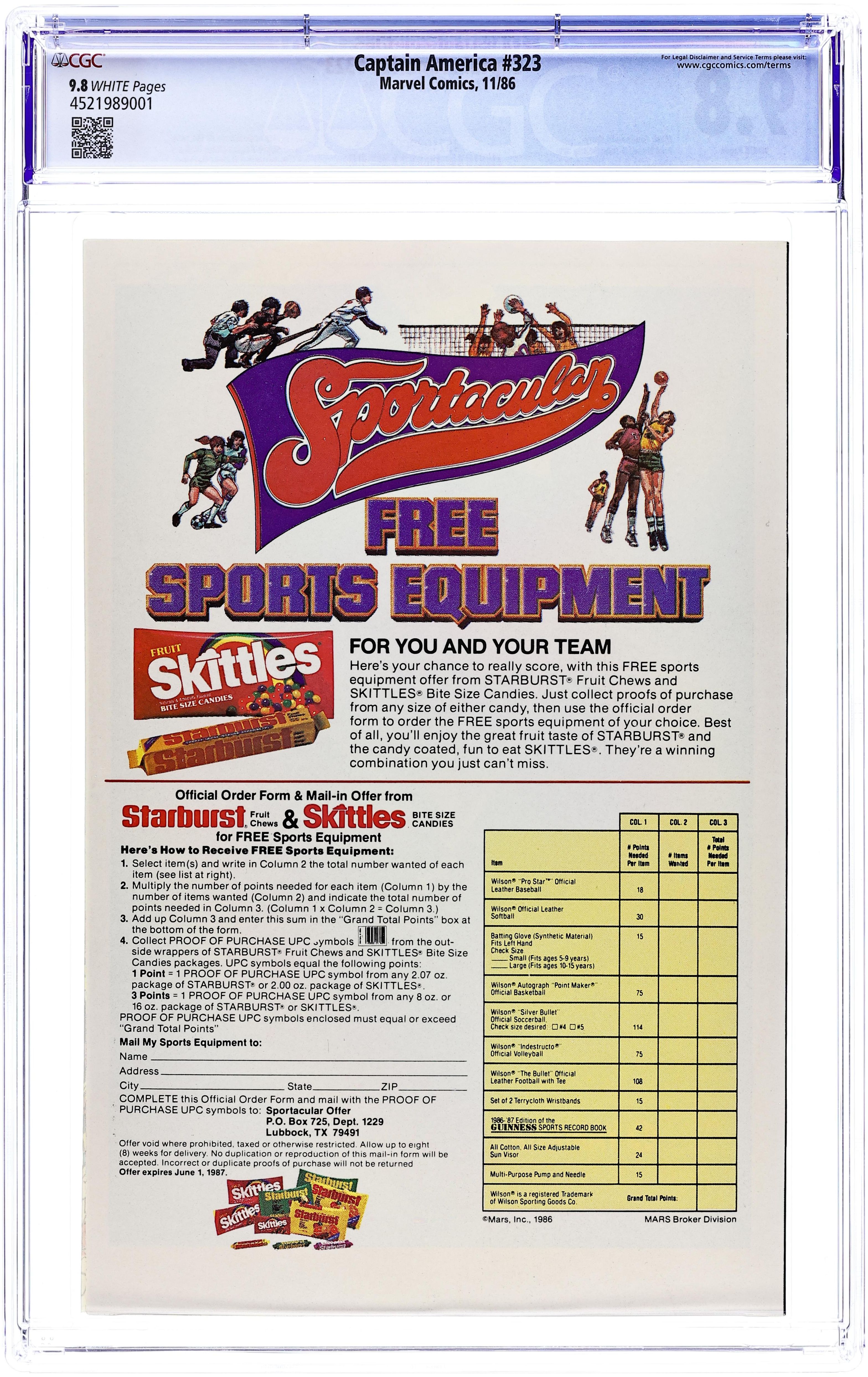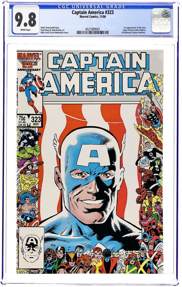Direct Edition. Marvel 25th Anniversary Cover - 1st appearance of new Super Patriot (US Agent), John Walker in "Super-Patriot is Here." Story by Mark Gruenwald. Art by Paul Neary and John Beatty. Cover by Mike Zeck and Josef Rubinstein. Captain America has received a lot of media attention after his shooting of an Ultimatum terrorist two issues ago. Now a new superhero called the Super-Patriot is trying to take Cap's place as America's patriotic hero. Cameo appearances by the Black Knight and Hercules. 36 pages Cover price $0.75. Grade: CGC 9.8 explanation of grade Condition: Used (collectible)