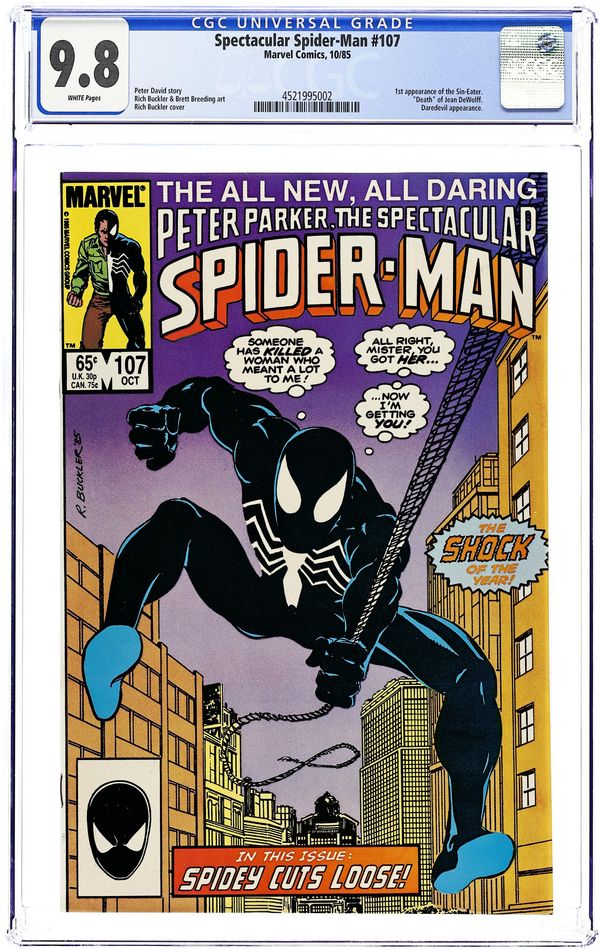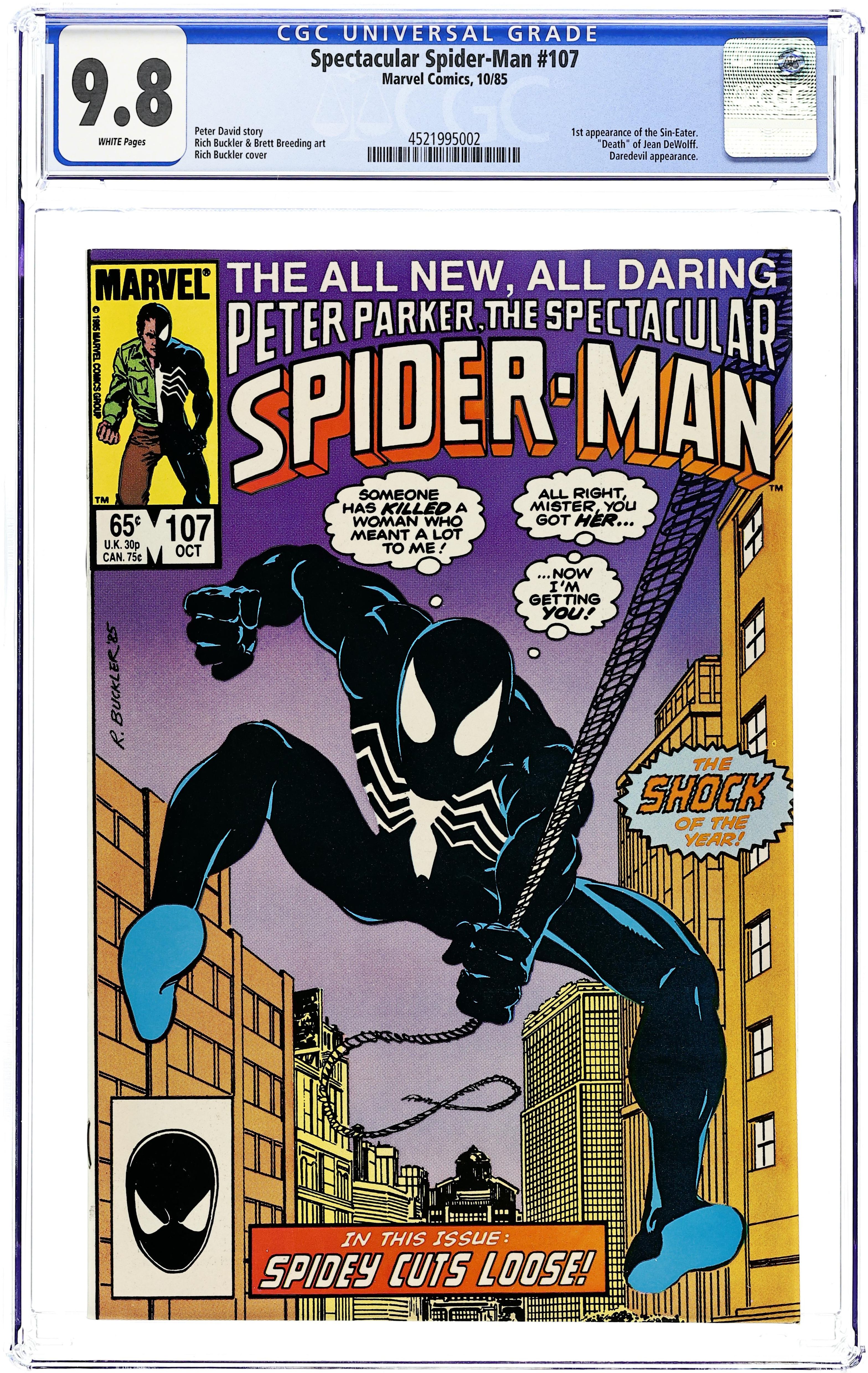 Direct Edition. "Original Sin" Part 1 of 4. Guest-starring Daredevil. Script by Peter David. Pencils by Rich Buckler. Inks by Brett Breeding. Cover by Rich Buckler. The critically acclaimed Death of Jean DeWolff storyline begins with this issue. In a stunning development, police captain Jean DeWolff is found murdered in her apartment. The entire city is in a state of shock over the killing including the police department, the staff at the Daily Bugle, and the Amazing Spider-Man. The web-slinger (in his black costume) begins investigating the homicide by meeting with the detective assigned to the case, Stan Carter. However, another superhero, Daredevil, gets the first shot at stopping the murderous rampage of the Sin-Eater! First appearance of the Sin-Eater. 32 pages Cover price $0.65. Grade: CGC 9.8 explanation of grade Condition: Used (collectible)