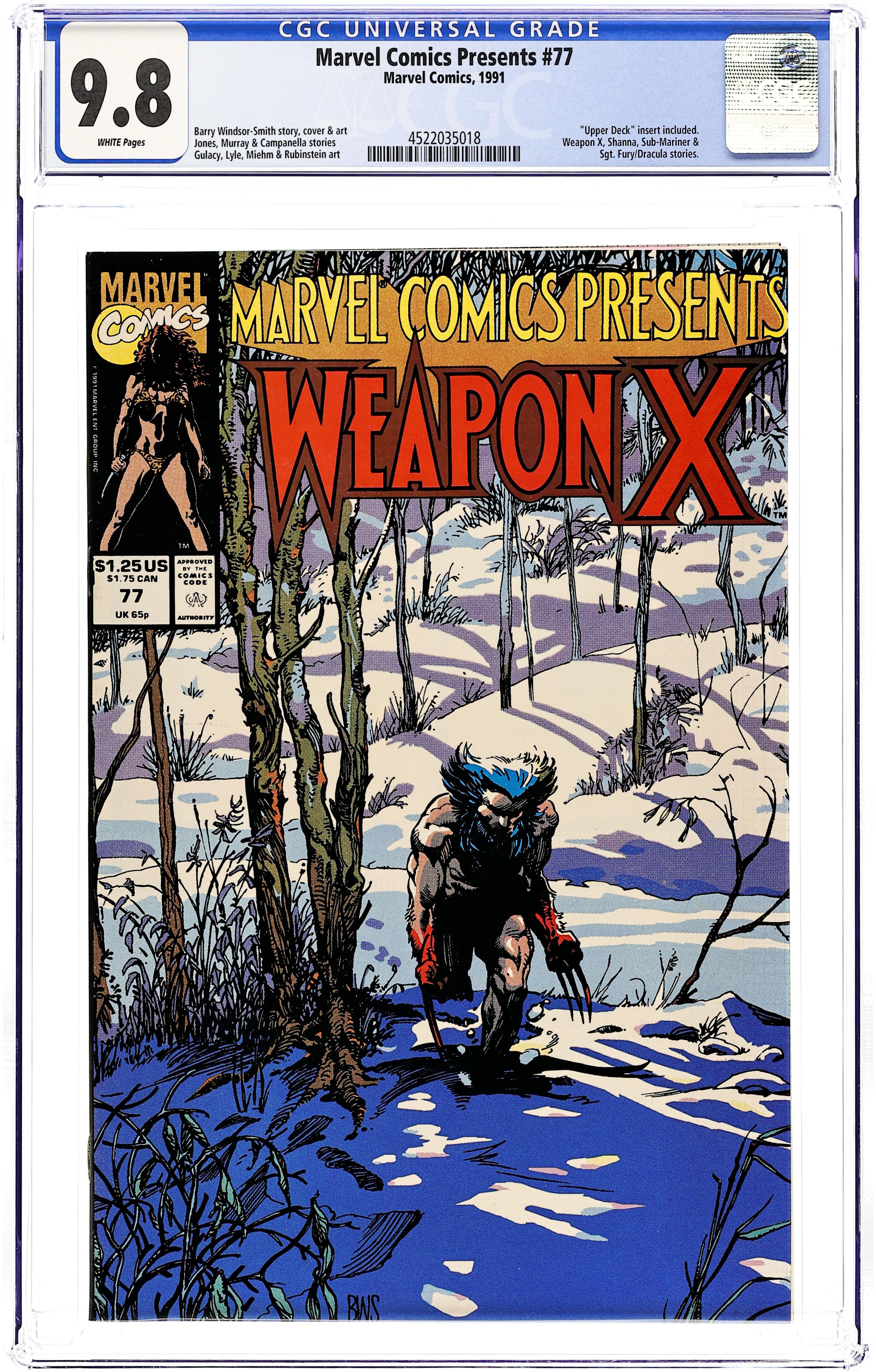 Direct Edition. Cover art by Barry Windsor-Smith. Weapon X (chapter 5), script and art by Barry Windsor-Smith. A Place In the Wilderness (The Bush of Ghosts part 10) starring Shanna the She-Devil, script by Gerard Jones, pencils by Paul Gulacy, inks by Gary Martin. Rude Awakening (Rumanian Rumble part 1) starring Sgt. Fury and Dracula, script by Doug Murray, pencils by Tom Lyle, inks by Joe Rubinstein and Art Nichols. The Tides That Bind starring The Sub-Mariner, script and inks by Robert Campanella, pencils by Grant Miehm. 36 pgs. Cover price $1.25. Grade: CGC 9.8 explanation of grade Condition: Used (collectible)
