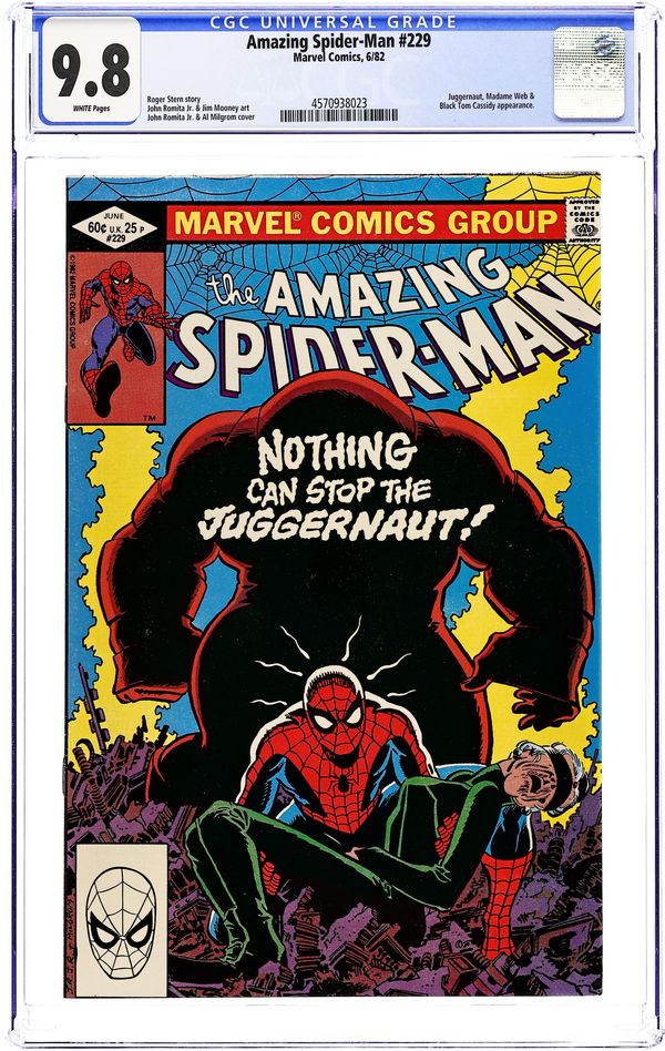 Direct Edition. Nothing Can Stop the Juggernaut!" Part 1 of 2. Script by Roger Stern. Art by John Romita Jr. (breakdowns) and Jim Mooney (finishes). Cover by John Romita Jr. and Al Milgrom. One of the classic Spider-Man stories of the bronze age! Black Tom Cassidy is tired of losing to the X-Men and thinks that having Madame Webs powers on his side would reverse his fortune! So he sends his indestructible friend to grab her! But Madame Web foresees the danger and calls her wall-crawling friend to save her! And in the middle of Manhattan, the Amazing Spider-Man meets the Juggernaut...for the life of Madame Web! This may become one of the web-slingers greatest victories...or one of his bitterest defeats. A two-part masterpiece! Cameo appearances by Wong, J. Jonah Jameson, Joe Robertson, and Betty Brant Leeds. (Notes: The Juggernaut previously appeared in Spider-Woman 38. Betty Brant was last seen in Amazing Spider-Man 197. This story was reprinted in 1989 in the trade paperback: The Sensational Spider-Man -- Nothing Can Stop the Juggernaut; and also in Spider-Man Magazine 3.) 36 pgs. Cover price $0.60. Grade: CGC 9.8 explanation of grade Condition: Used (collectible)