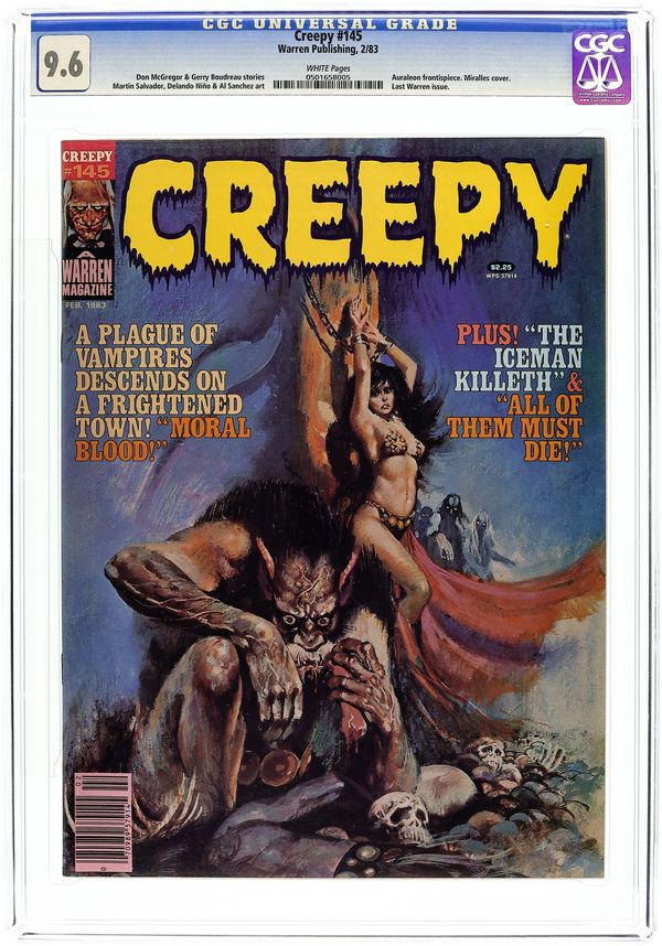 This final Warren issue includes the following stories: Moral Blood part three by Don McGregor and Al Sanchez; All of them Must Die! by Gerry Boudreau, Randy Palmer, and Martin Salvador; and The Iceman Killeth by Michael Fleischer and Delando Nino. Cover art by Jose Mirelles. Cover price $2.25. Grade: CGC 9.6 explanation of grade Condition: Used (collectible)