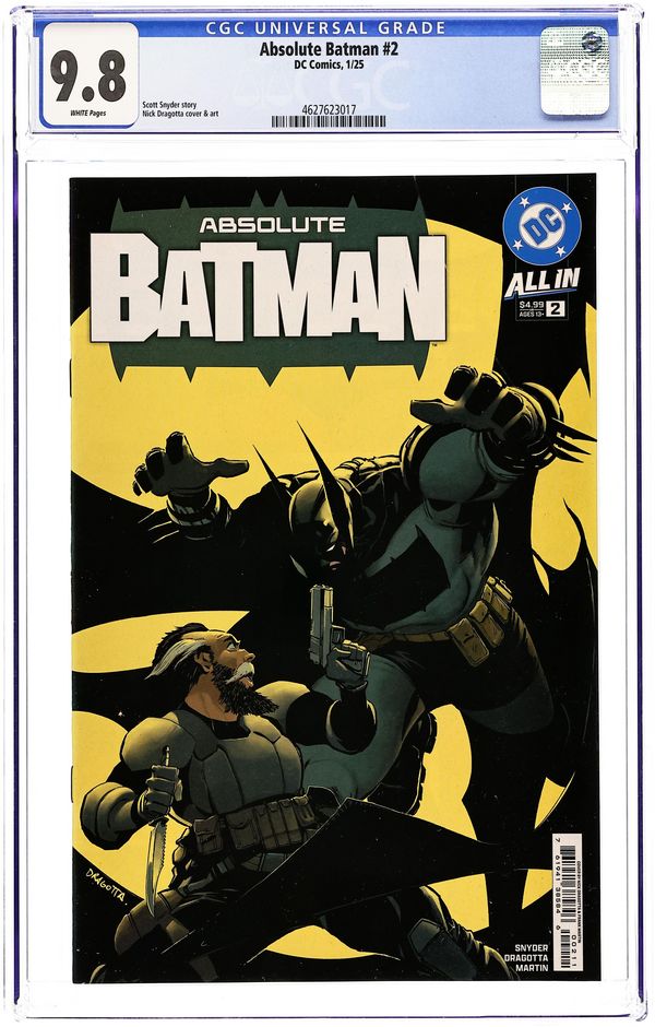 Ended Oct 17 2025 Bid History 14 bids Winning Bid $46 Written by Scott Snyder. Art by Nick Dragotta. Cover by Nick Dragotta. SNYDER AND DRAGOTTA'S BRAND-NEW TAKE ON THE DARK KNIGHT RAMPAGES ON! Batman was born out of violence - a horrible tragedy that shaped the trajectory of his future. But when a vigilant MI6 agent starts tracking the lonely life of Bruce Wayne, he discovers the interconnectivity between a hero's shell life and the many layers of the Black Mask Gang. It's Batman versus Alfred Pennyworth! 28 pages, full color. Rated T+ Cover price $4.99. Grade: CGC 9.8 explanation of grade Condition: Used (collectible) unless item is a new release