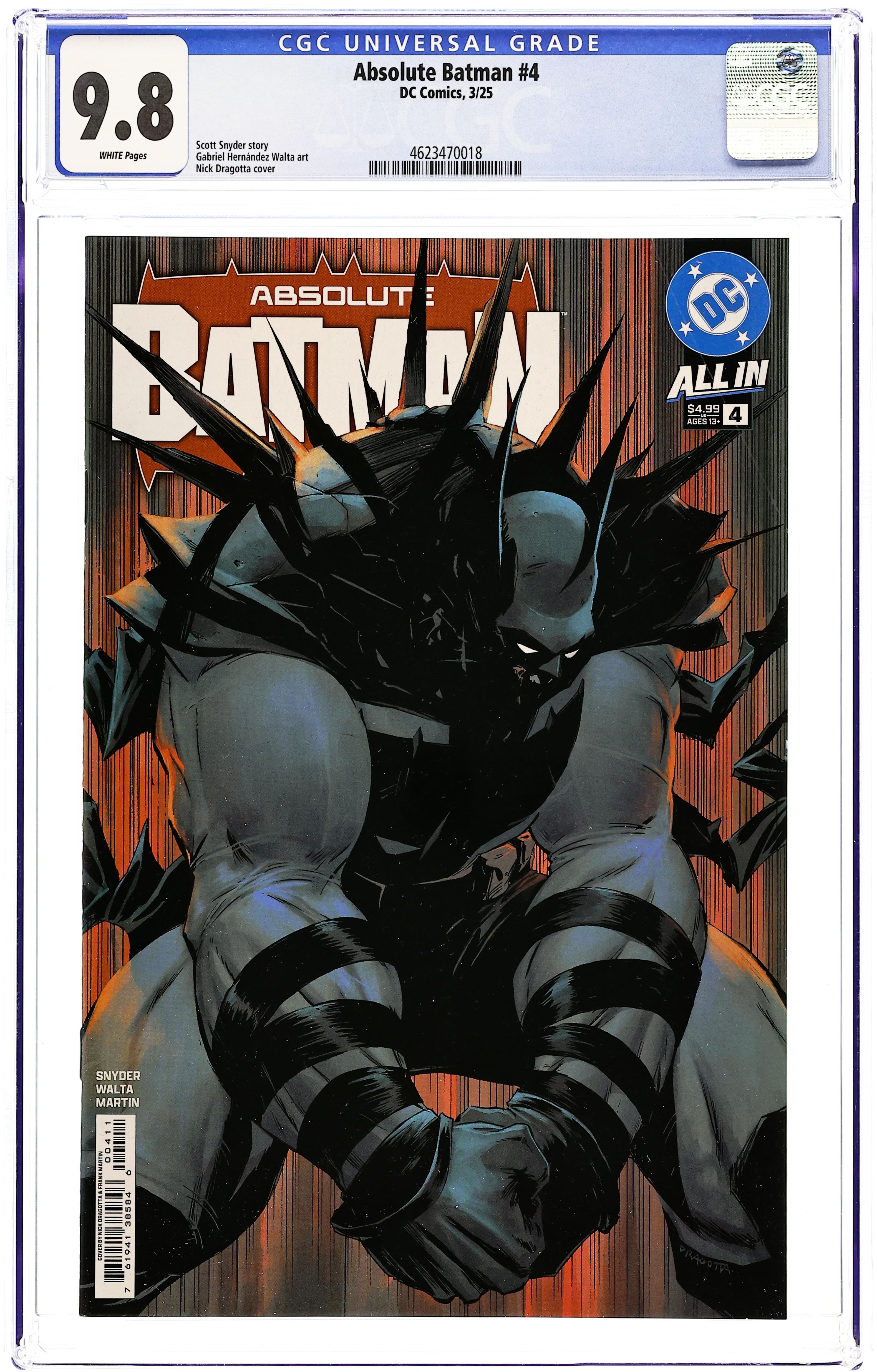 Ended Oct 17 2025 Bid History 17 bids Winning Bid $50 Written by Scott Snyder. Art by Gabriel Walta. Cover by Nick Dragotta. Absolute Batman has established himself as an extremely large force to be reckoned with. But how did he get to this point? How did he push himself? And how did the tragic events of his childhood, and the advice of his father, shape the man who he became...literally? Guest artist Gabriel Walta joins for this essential origin issue of Absolute Batman to explore Bruce Wayne's past, and his inevitable future to go BIGGER. Don't miss this pivotal issue! 28 pages, full color. Rated T+ Cover price $4.99. Grade: CGC 9.8 explanation of grade Condition: Used (collectible) unless item is a new release