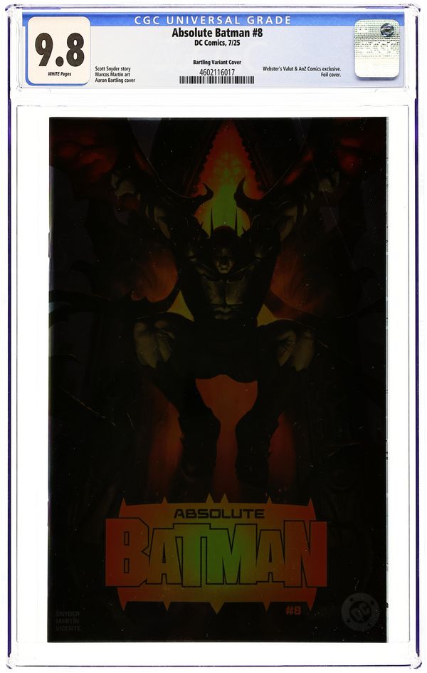 Ended Oct 17 2025 Bid History 8 bids Winning Bid $30 Webster's Vault and AnZ Comics Exclusive Foil Edition Variant Cover by Aaron Bartling. Written by Scott Snyder. Art by Marcos Martin. GOTHAM IN THE GRASP OF MR. FREEZE! Batman is in the fight for his life against this icy new threat. But in the end, what terrifying truth will be unearthed about Ark M and...Joker? 32 pages, full color. Rated T+ Cover price $5.99. Grade: CGC 9.8 explanation of grade Condition: Used (collectible) unless item is a new release