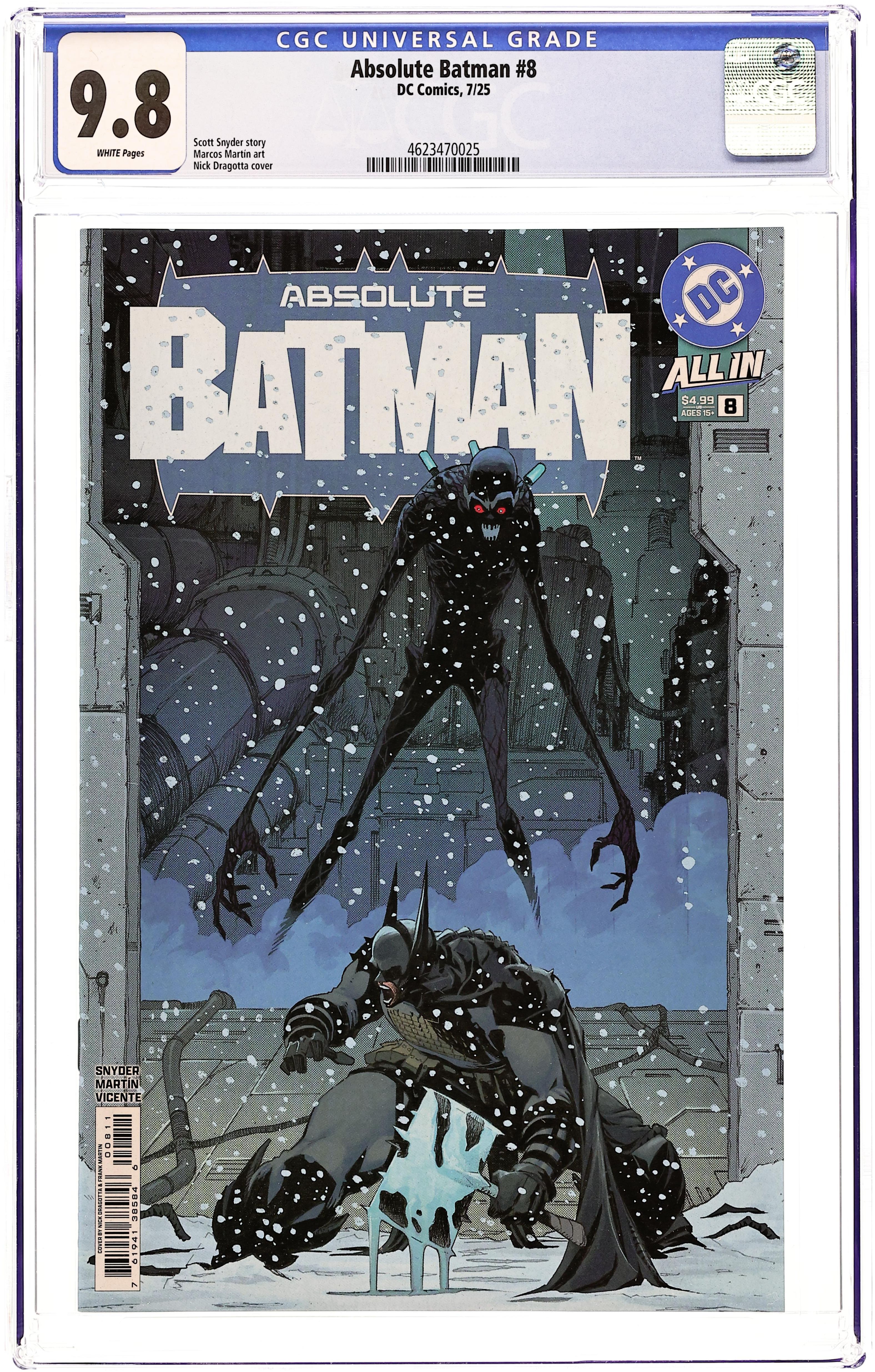 Ended Oct 17 2025 Bid History 13 bids Winning Bid $34 Written by Scott Snyder. Art by Marcos Martin. Cover by Nick Dragotta. GOTHAM IN THE GRASP OF MR. FREEZE! Batman is in the fight for his life against this icy new threat. But in the end, what terrifying truth will be unearthed about Ark M and...Joker? 28 pages, full color. Rated T+ Cover price $4.99. Grade: CGC 9.8 explanation of grade Condition: Used (collectible) unless item is a new release