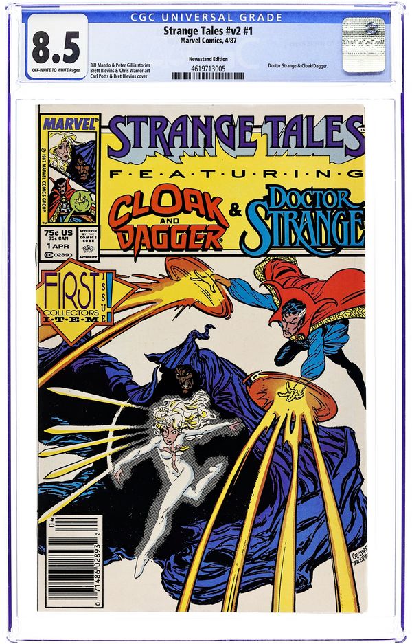 Starts Dec 8 Newsstand Edition. Strange Tales is a double feature series starring the Master of the Mystic Arts, Doctor Strange, and the original runaways, Cloak & Dagger. "Daddy!" Part 1 of 2. Story by Bill Mantlo. Art by Brett Blevins. Cloak and Dagger arrive in India and come across a cult who worships the power of light. But there's more to them that meets the eye, and things get complicated when Dagger's estranged father appears to be the leader of the cult. "And have not Charity!" Part 1 of 2. Story by Peter Gillis. Art by Chris Warner and Randy Emberlin. Doctor Strange struggles with his love for the sorceress Clea and his duty as the Sorcerer Supreme. Meanwhile, a dark force asserts itself on the mortal plane. 36 pgs. Cover price $0.75. Grade: CGC 8.5 explanation of grade Condition: Used (collectible)
